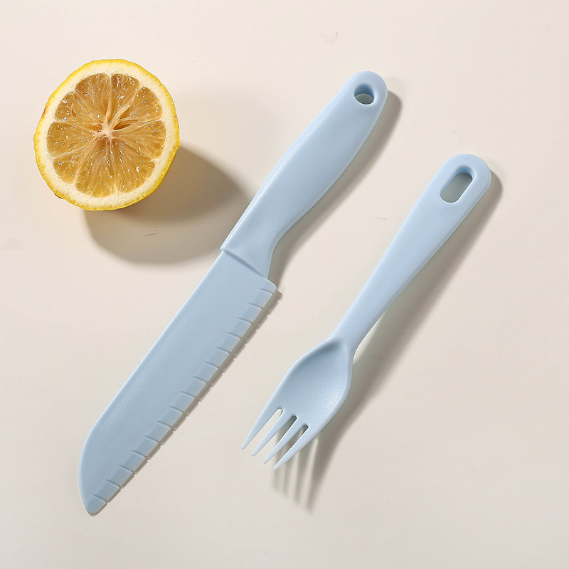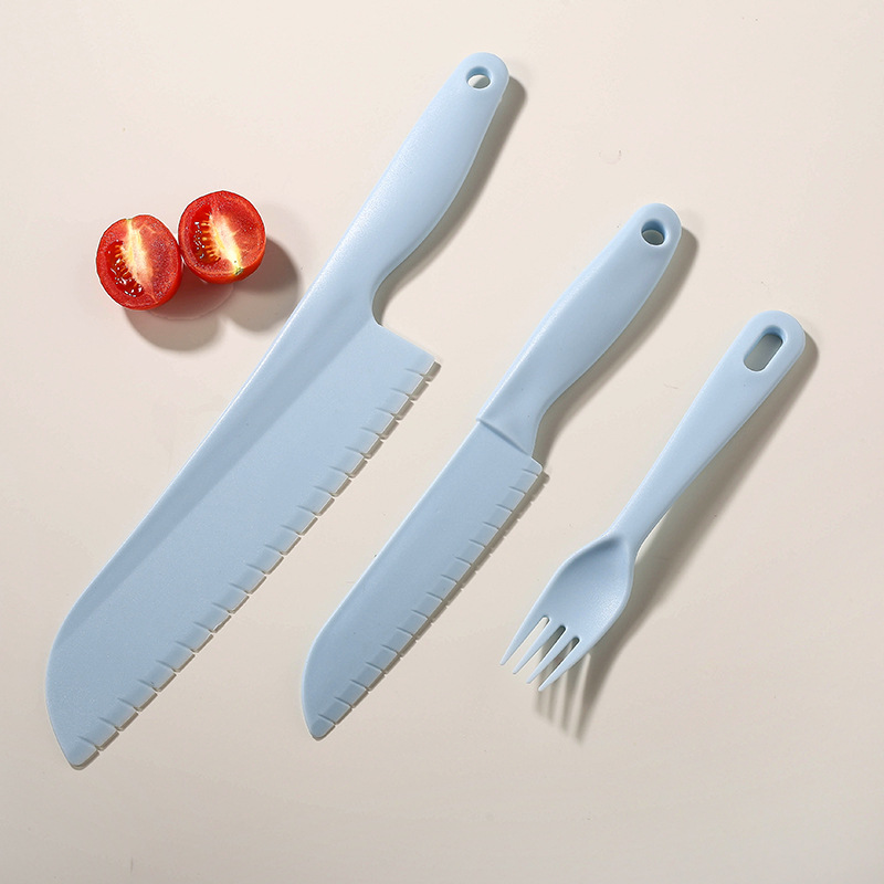 blue [big knife + small knife + fork + round dishboard]]