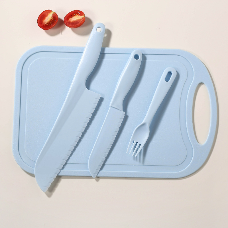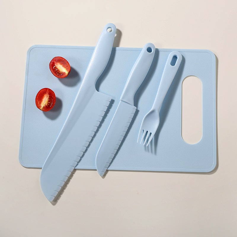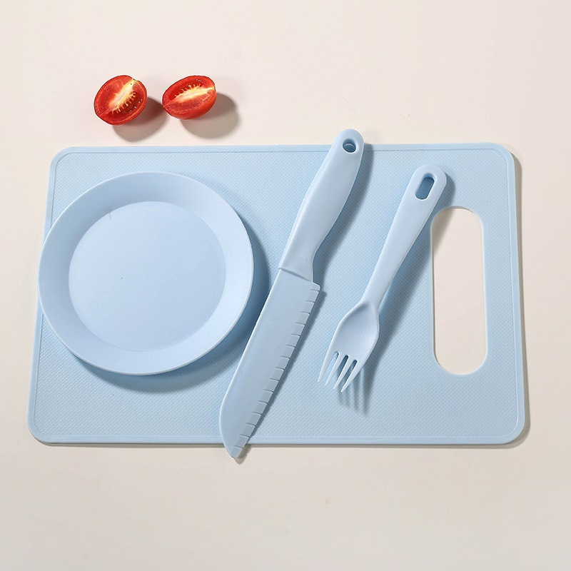 blue [big knife + small knife + fork + square cutting board]]
