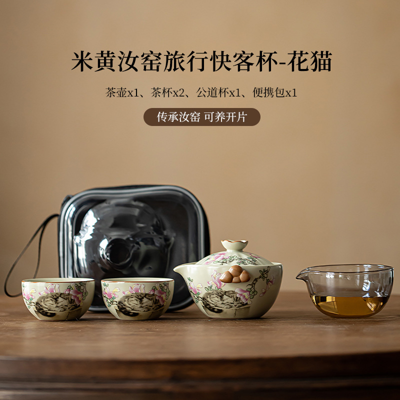 beige ru ware travel convenient tea cup set-flower cat