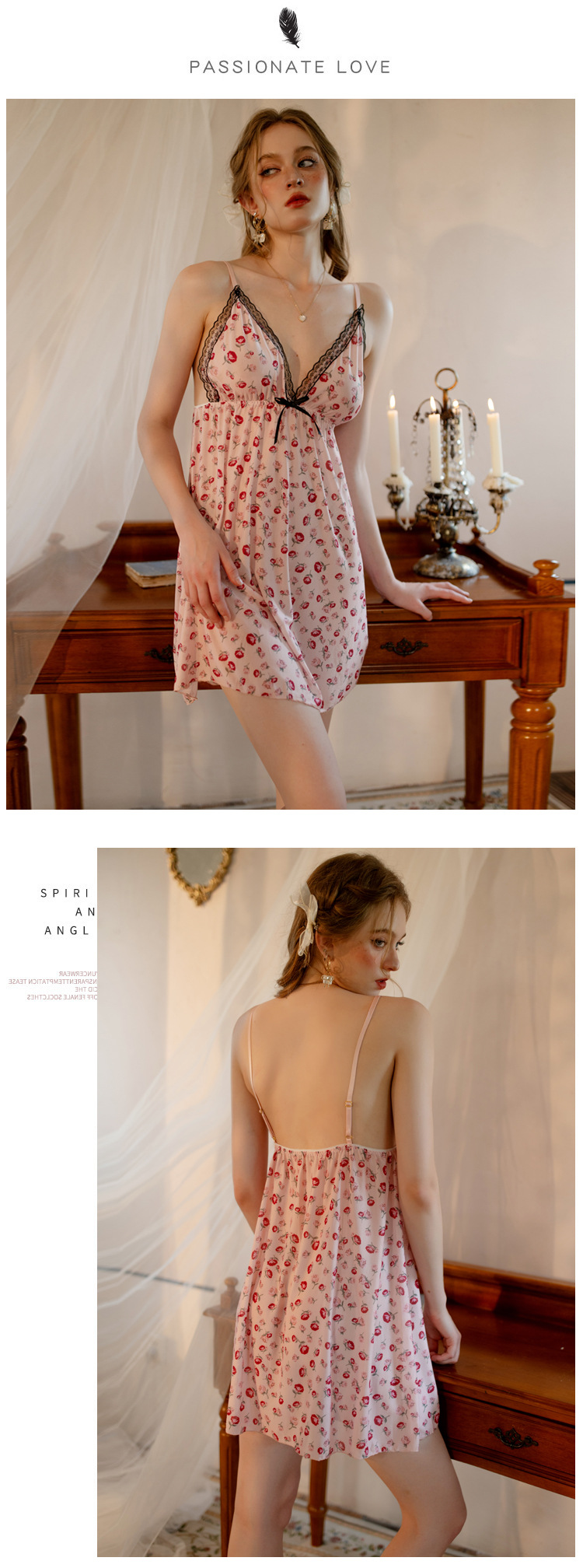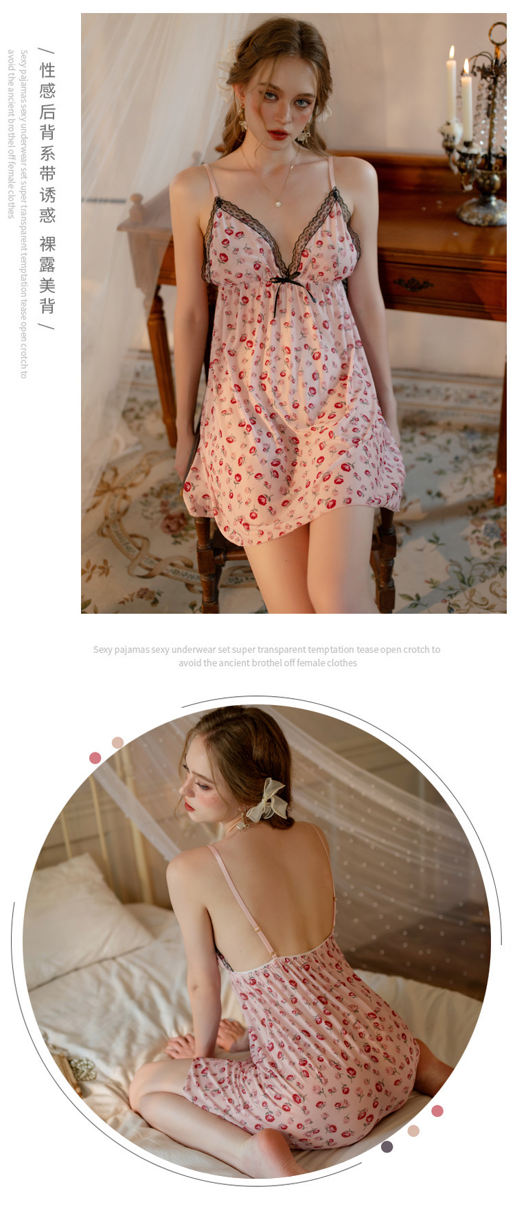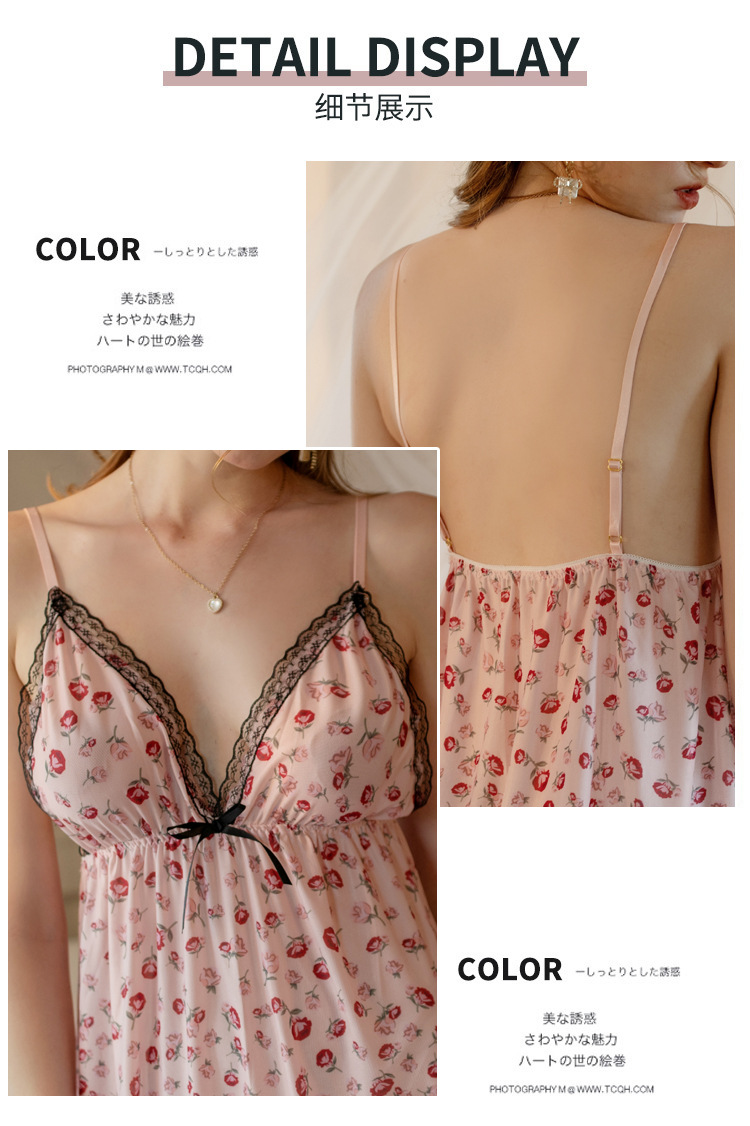 sexy sling nightdress women's deep v printed lace edge home pajamas hot backless sexy lingerie pure floral