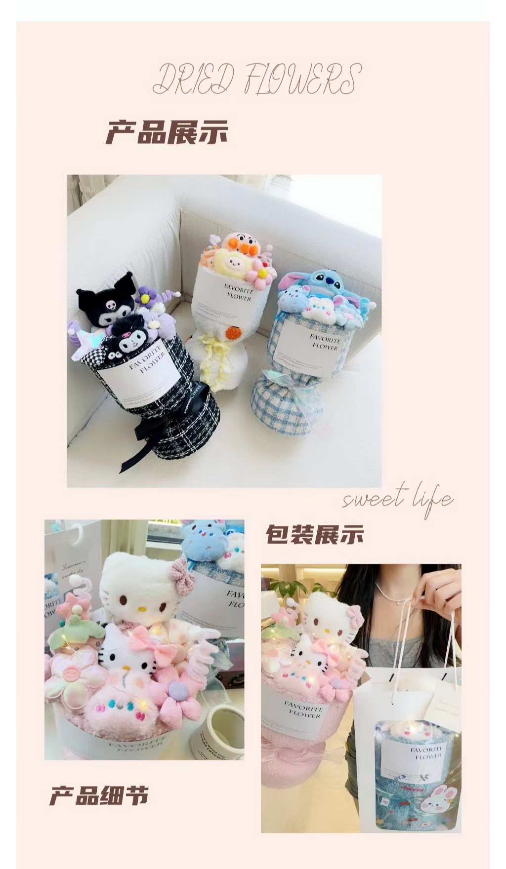 teddy fleece cloth cartoon hello kitty + handbag + lighting chain + greeting card