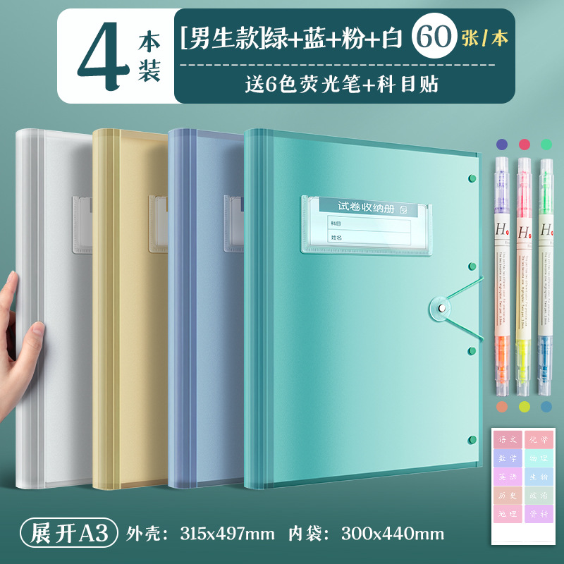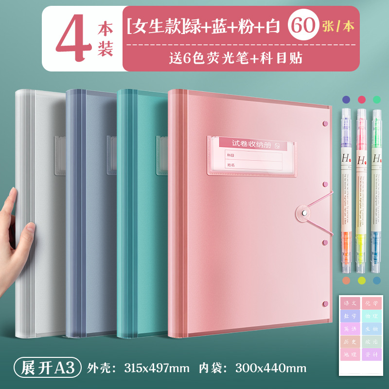 4 books/white powder, blue and green/60 pages for each book, fluorescent pen + subject stickers are given.