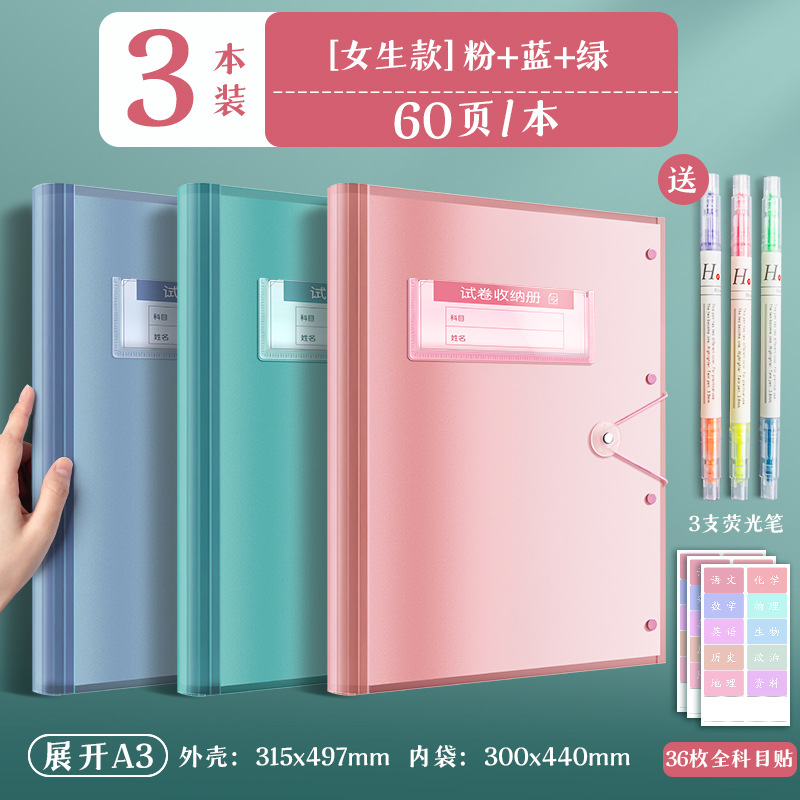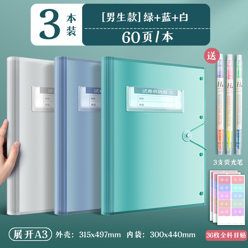 3 books/blue, white and green/60 pages per book for free fluorescent pen + subject stickers