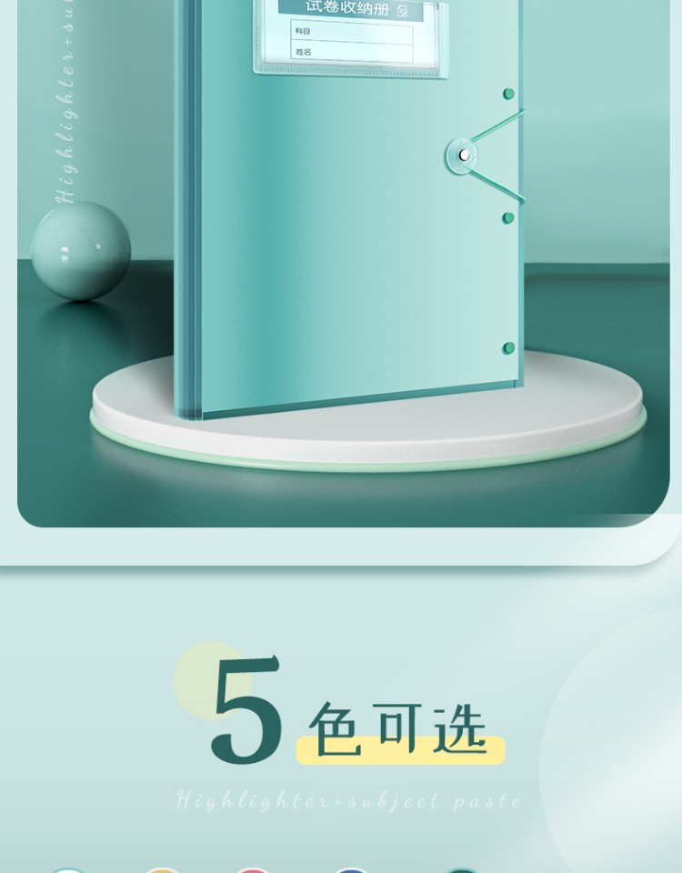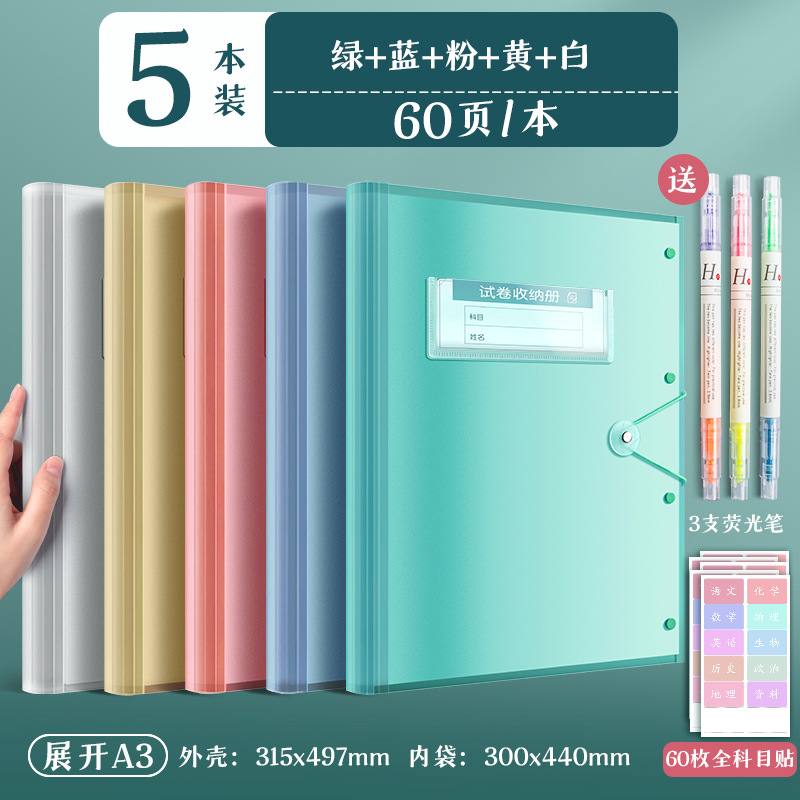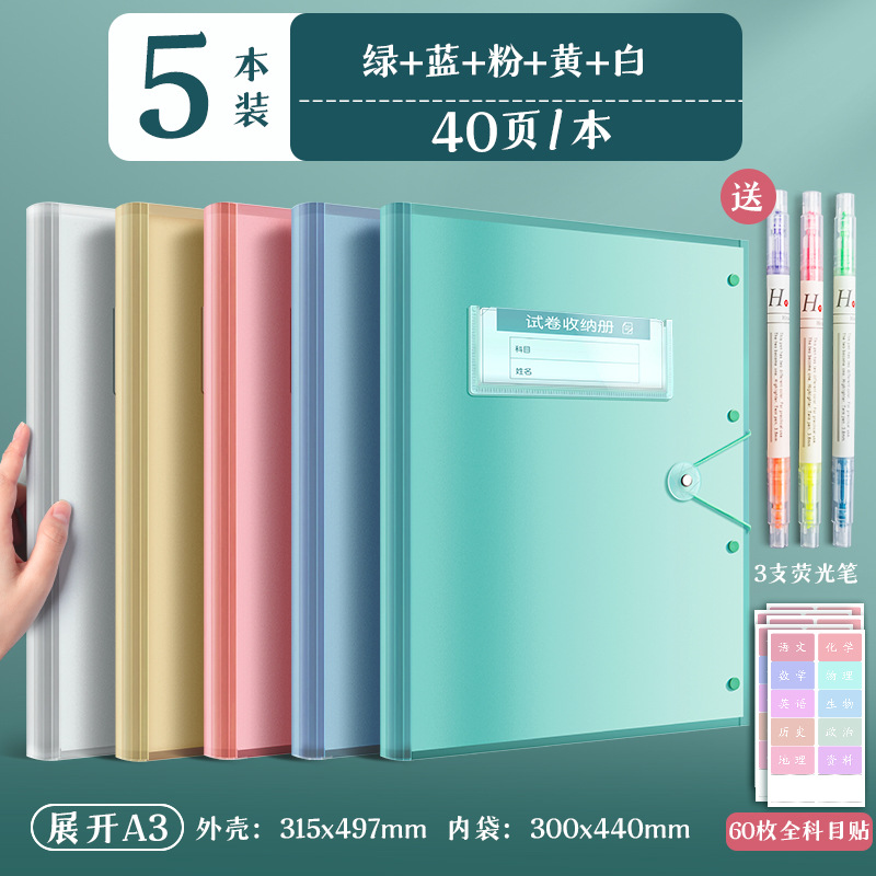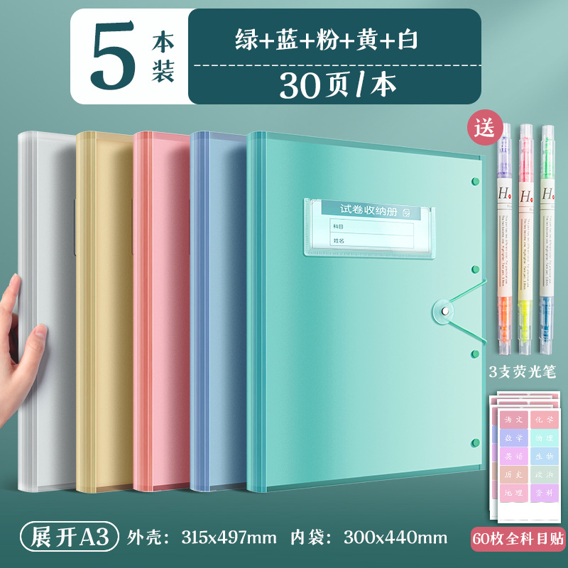 5 books/blue, white and green yellow and pink/30 pages per book, free fluorescent pen + subject stickers