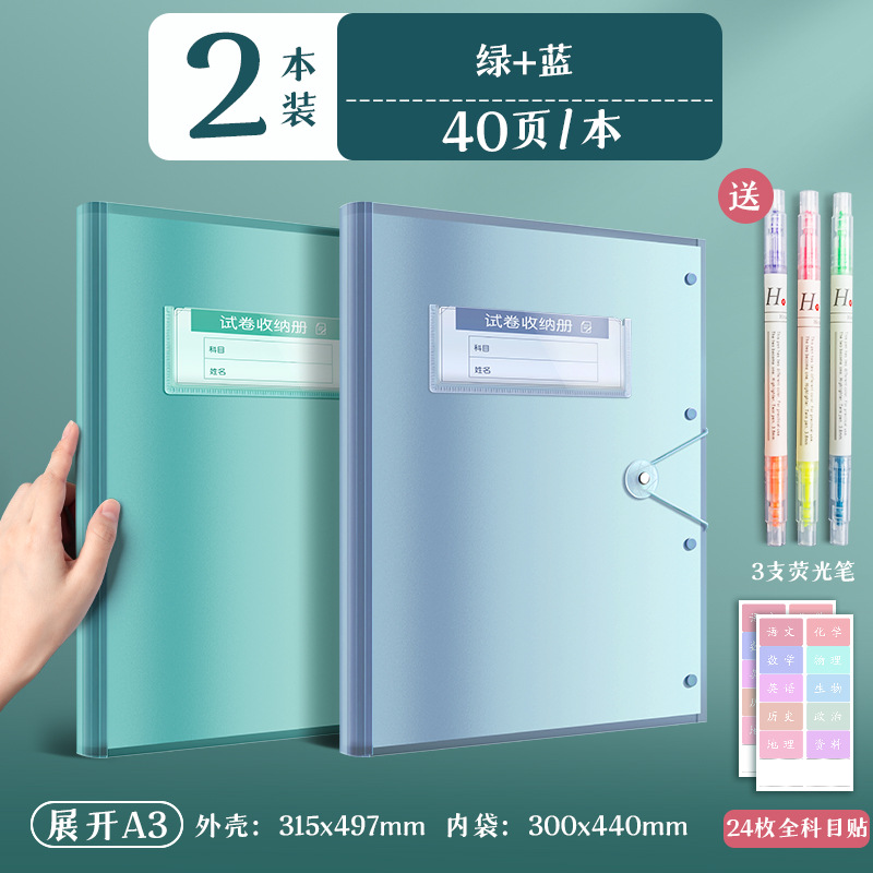 2 books/blue and green/40 pages per book for free fluorescent pen + subject stickers