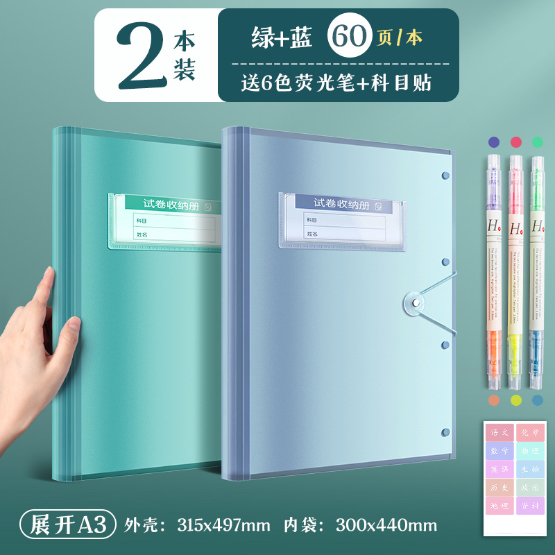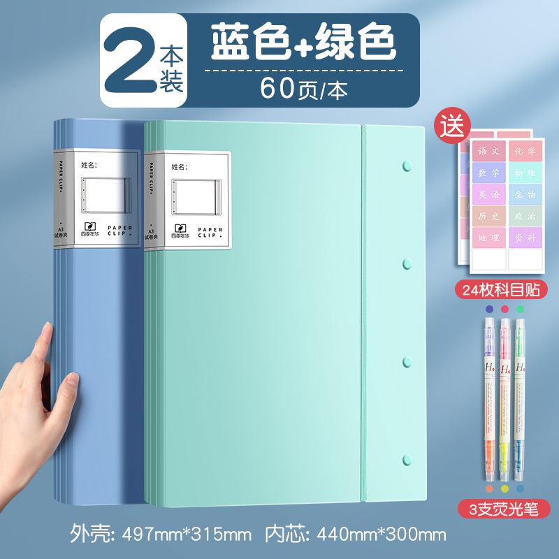 recommend/2 books/blue and green/60 pages per book + fluorescent pen + subject stickers