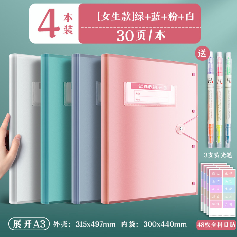 4 books/white pink blue green/30 pages per book for free fluorescent pen + subject stickers