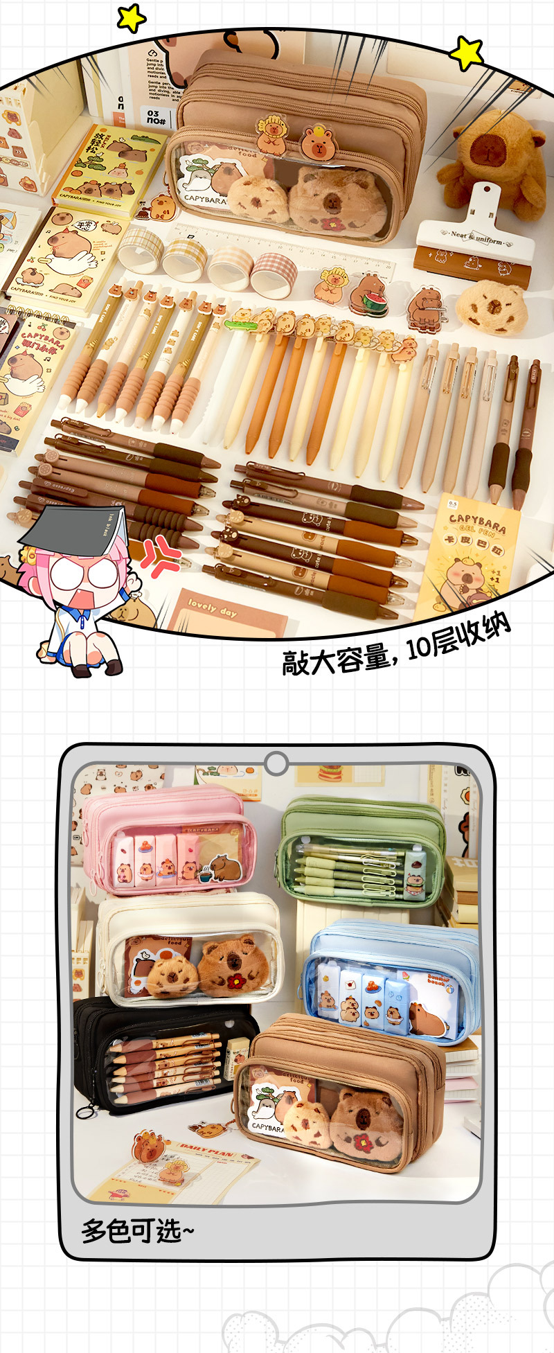 [upgrade 10-layer large capacity] beige pencil case +5 stickers +2 clips +1 pendant + chest