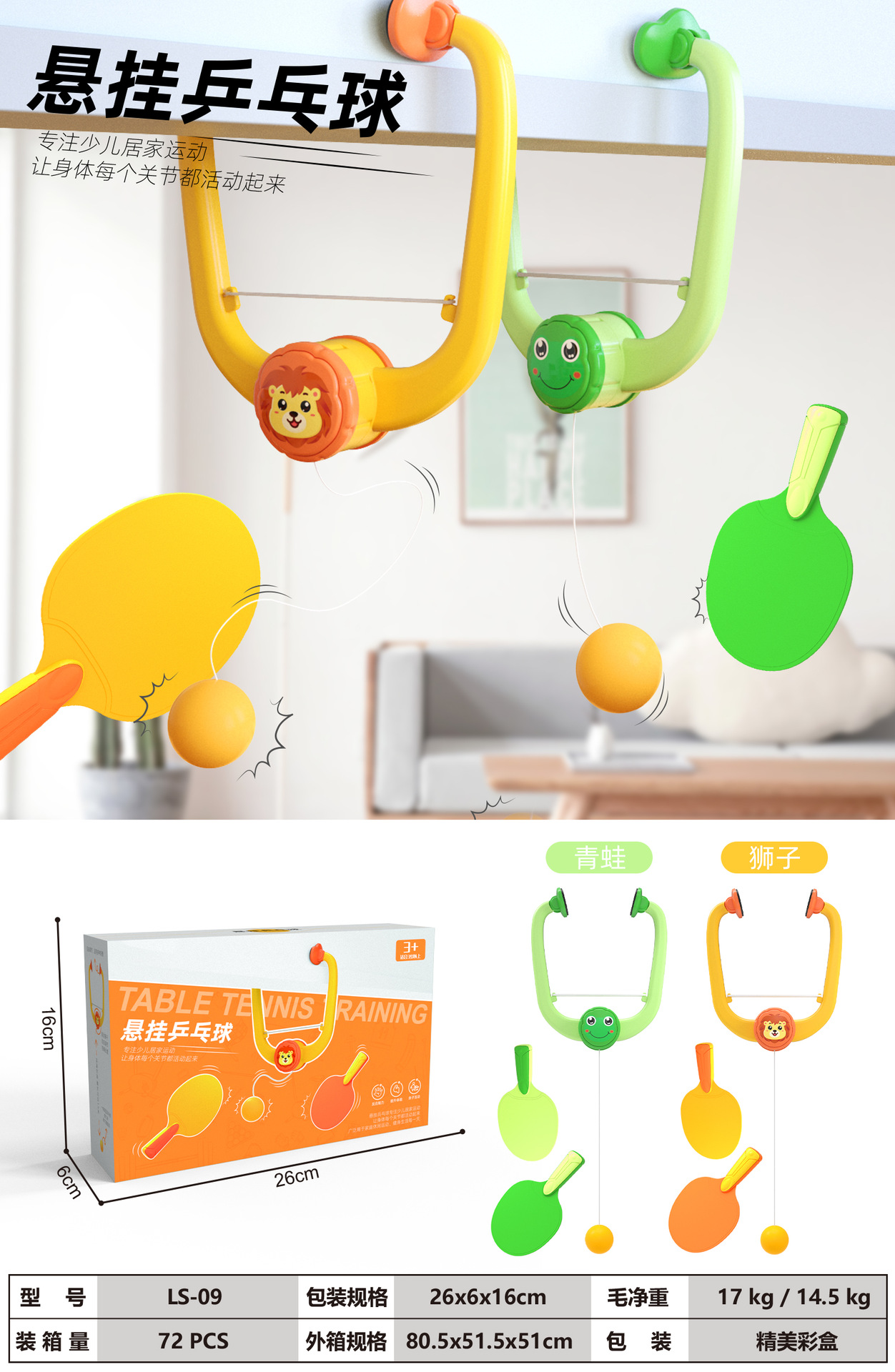 color box frog green [3 balls and two rackets] + hanger