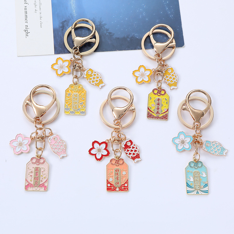 New Text Blessing Metal Keychains Pendant Creative Cherry Blossom Koi Car Key Chain Bag Ornament Gifts