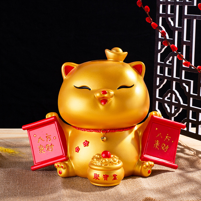 064 large fu character gold lucky cat (gold)
