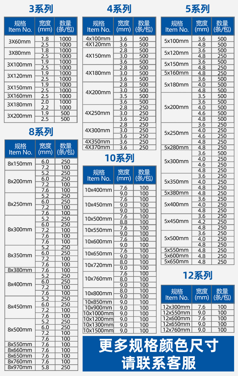 | 4*150 (3.6mm) 500 pieces; blue | CN¥ 11.28 | 9999 pack available |