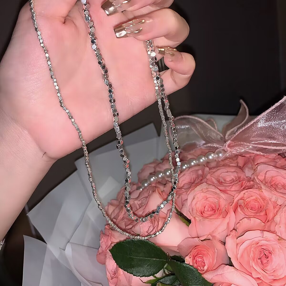 broken silver pearl stitching necklace