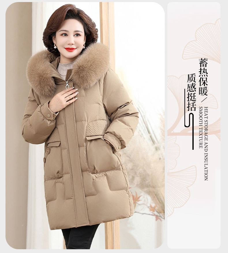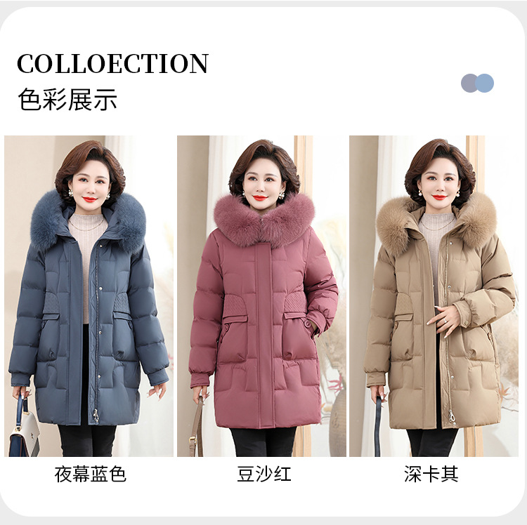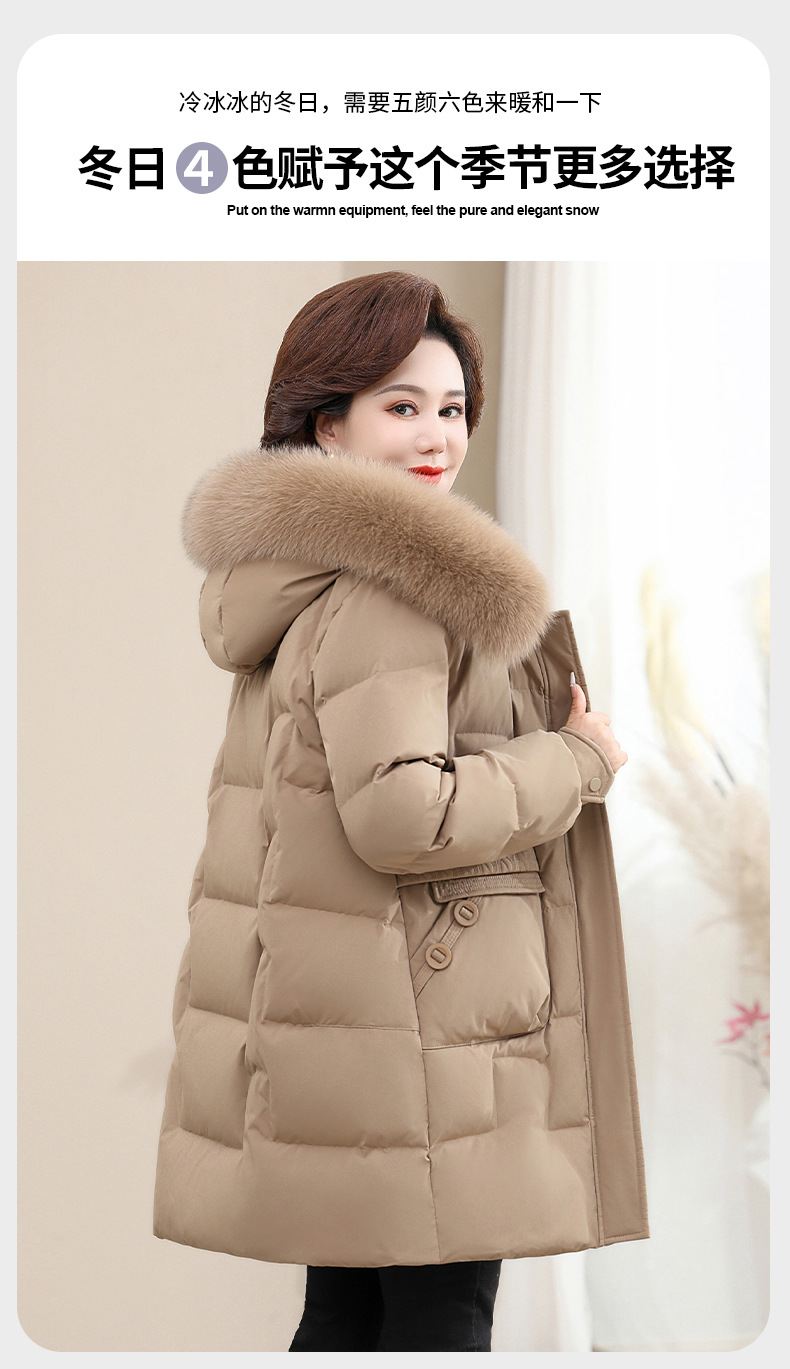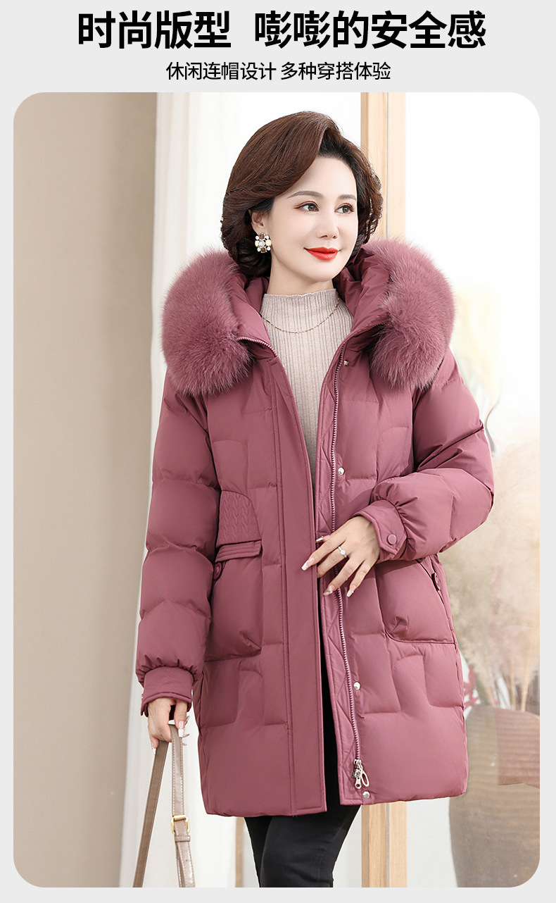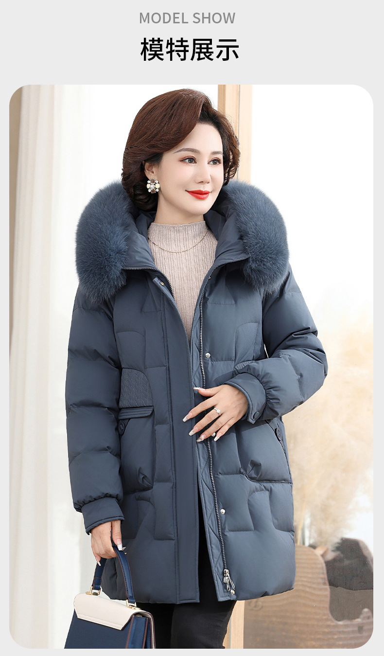 2024 winter middle-aged and elderly women's down jacket solid color hooded large fur collar warm mom wear white duck down coat