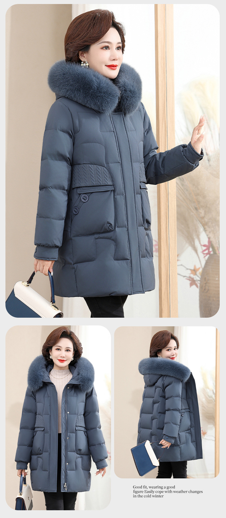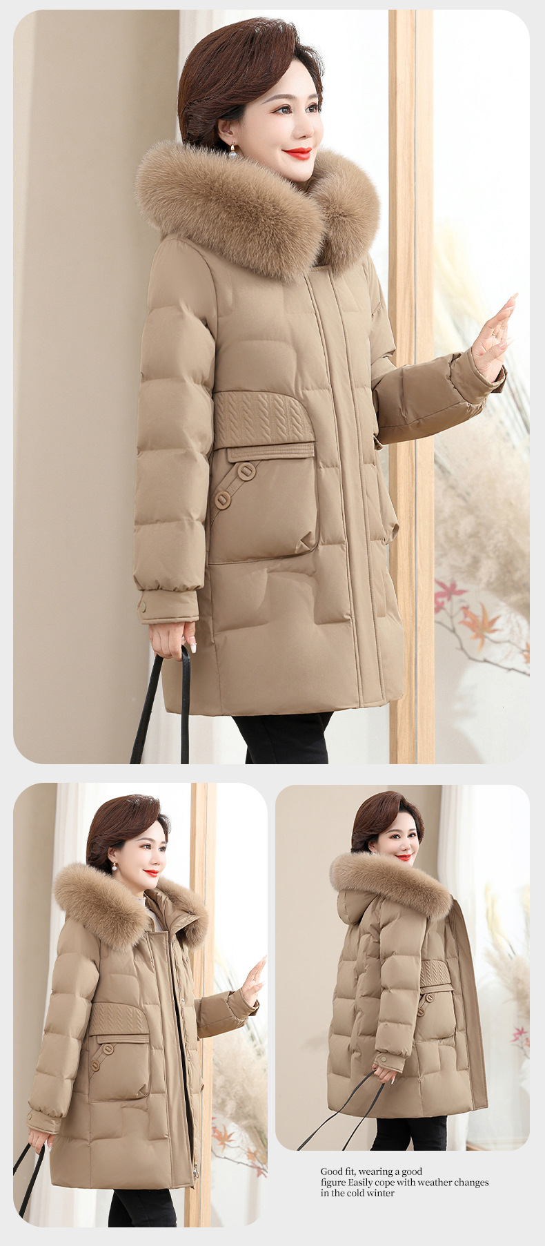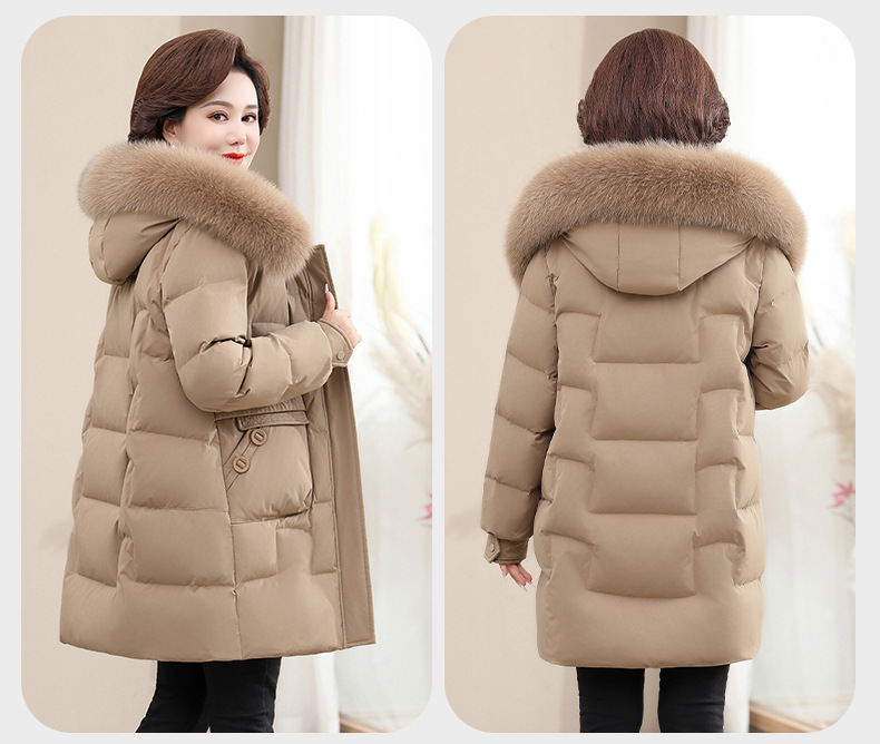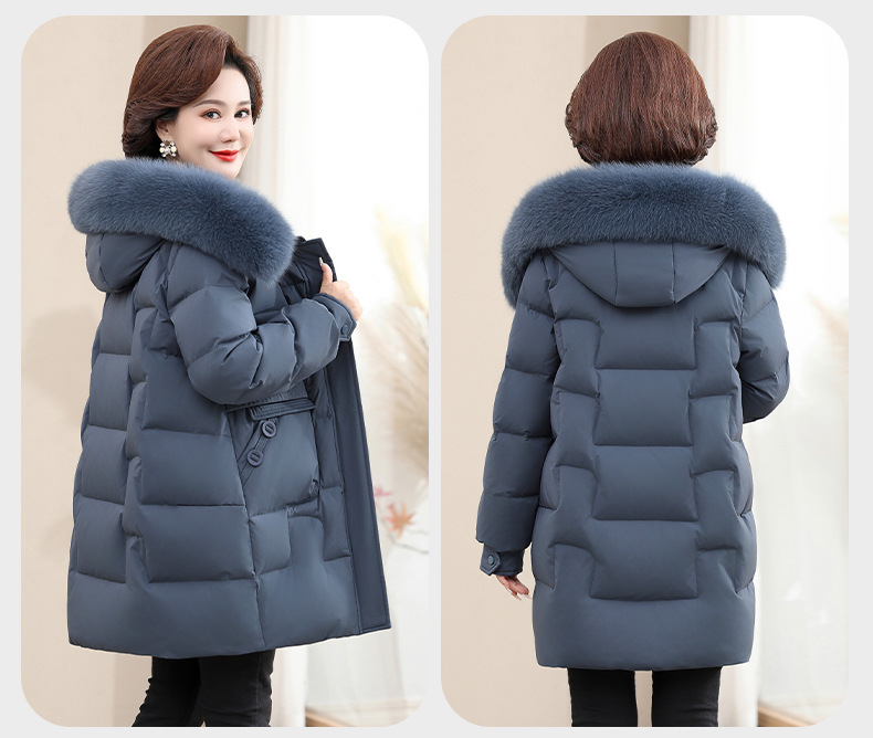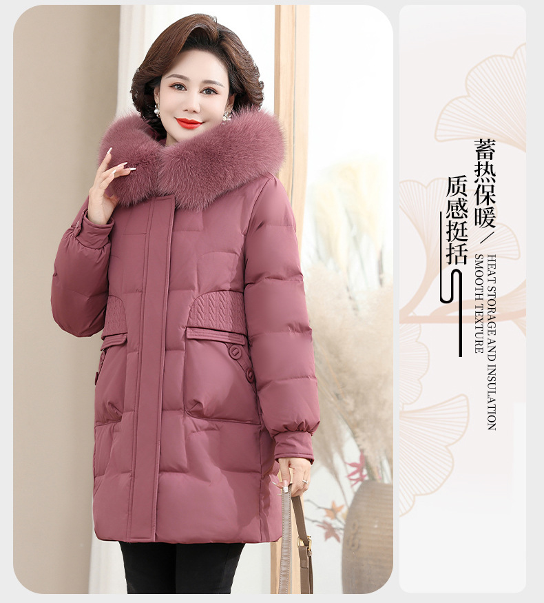 2024 winter middle-aged and elderly women's down jacket solid color hooded large fur collar warm mom wear white duck down coat