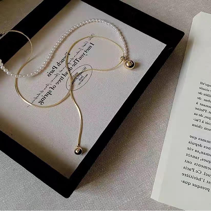 gold titanium steel glass pearl pull necklace