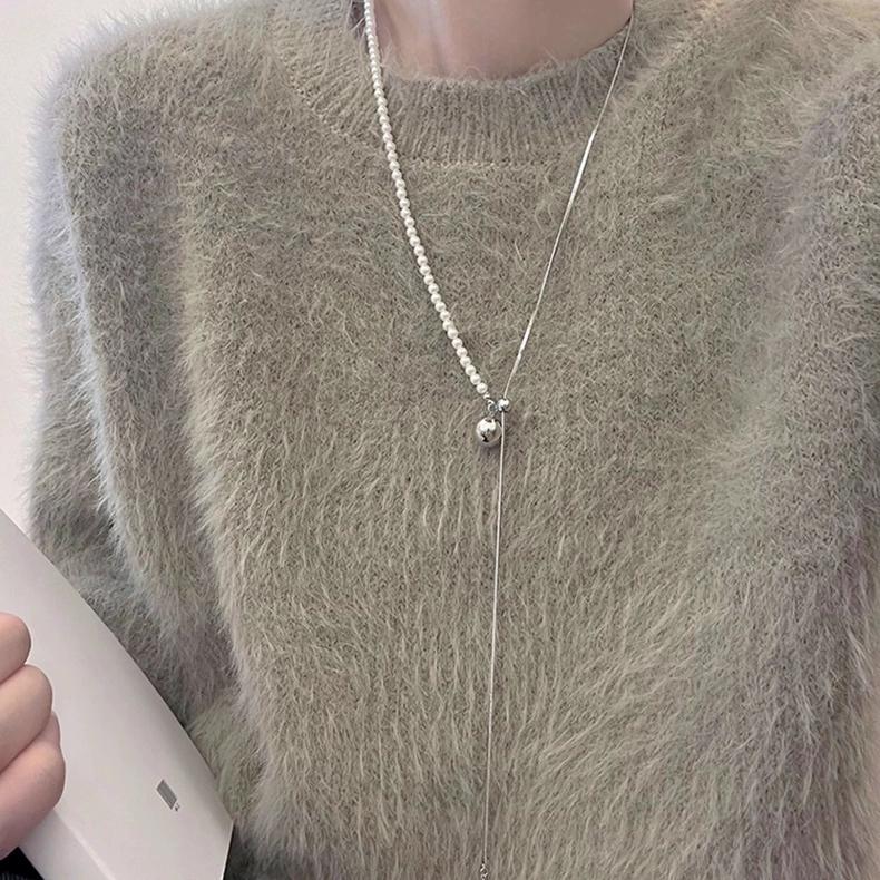 silver titanium steel glass pearl pull necklace