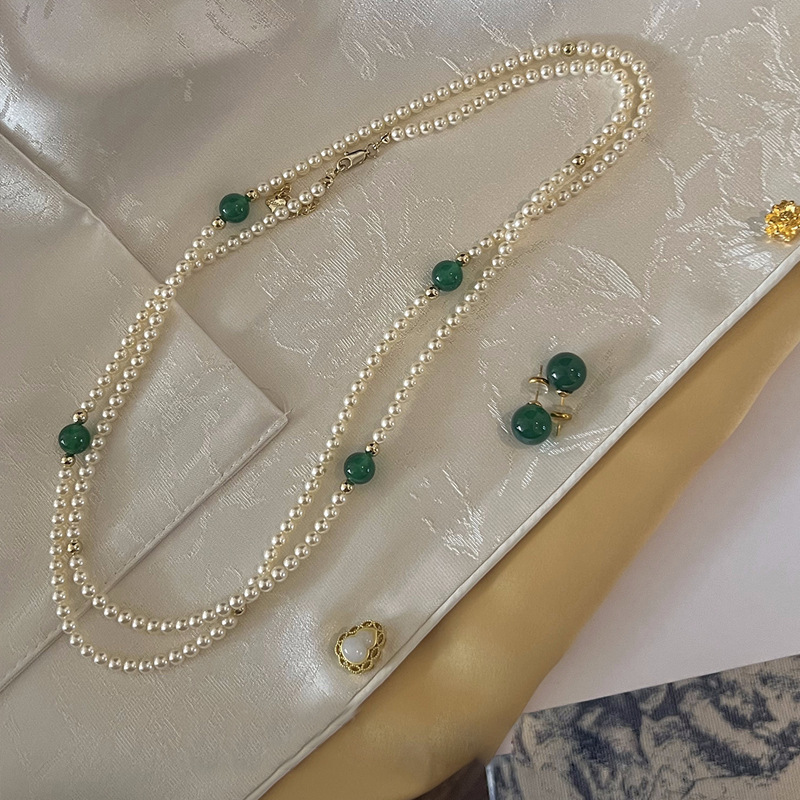 long green agate glass pearl necklace