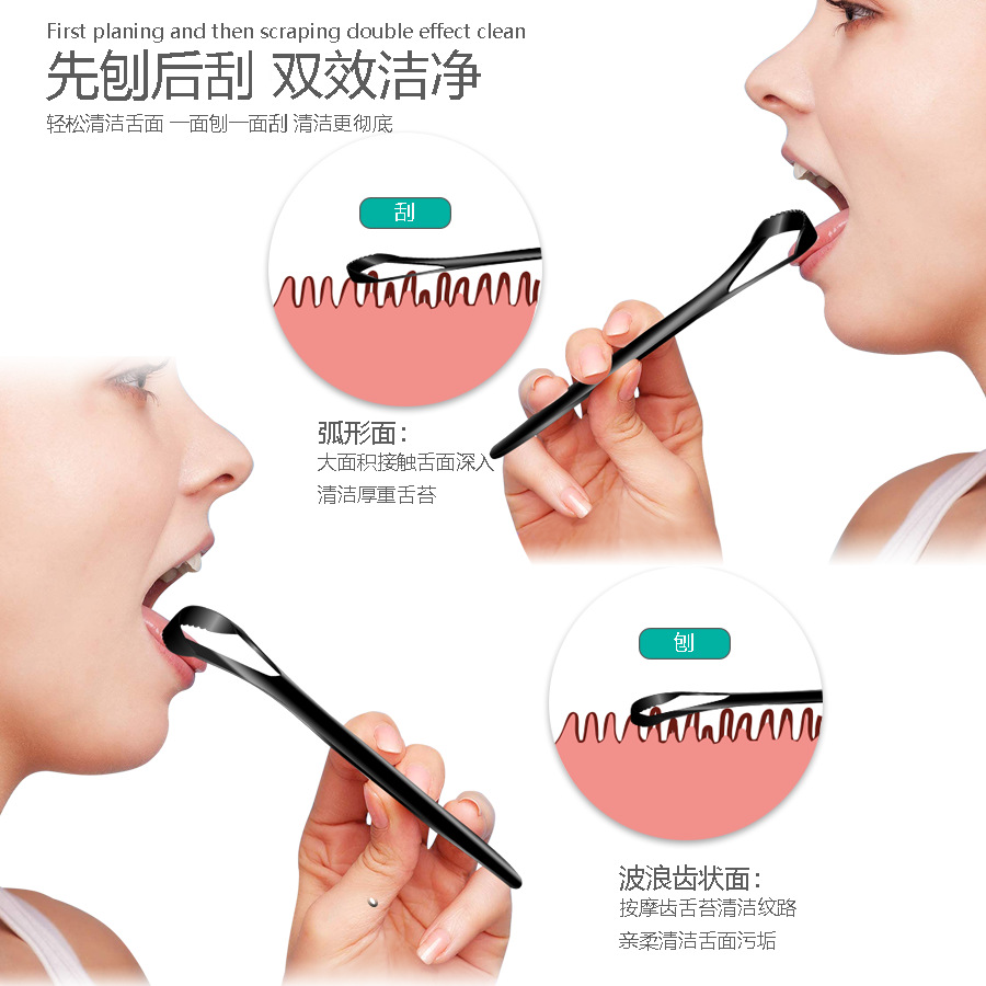 serrated double-sided black tongue scraper (color box)