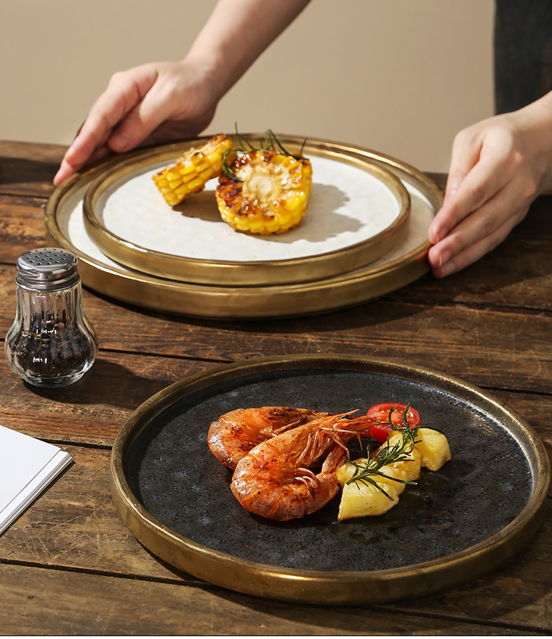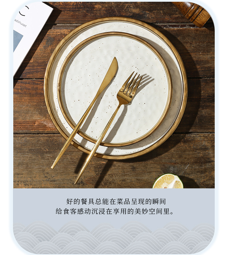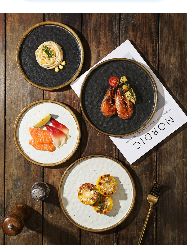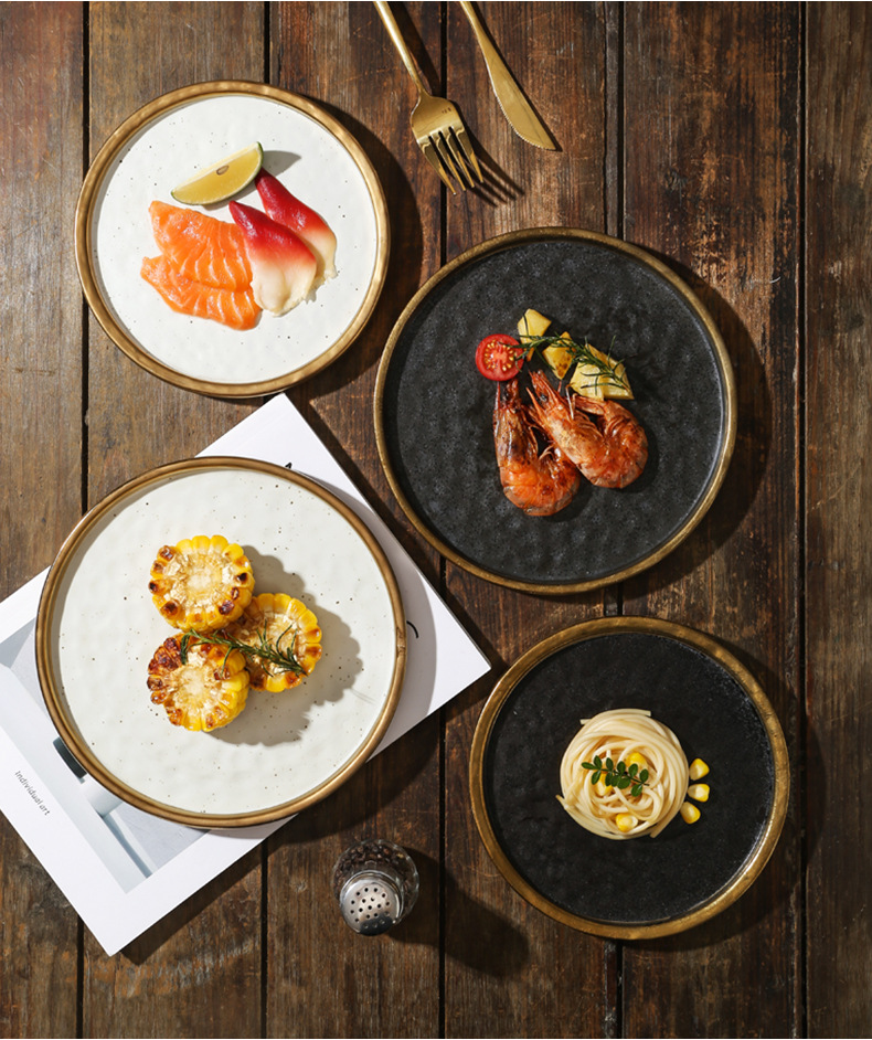 cross-border gold-plated ceramic plate flat plate shallow plate pasta western food plate steak plate household dinner plate light luxury commercial tray