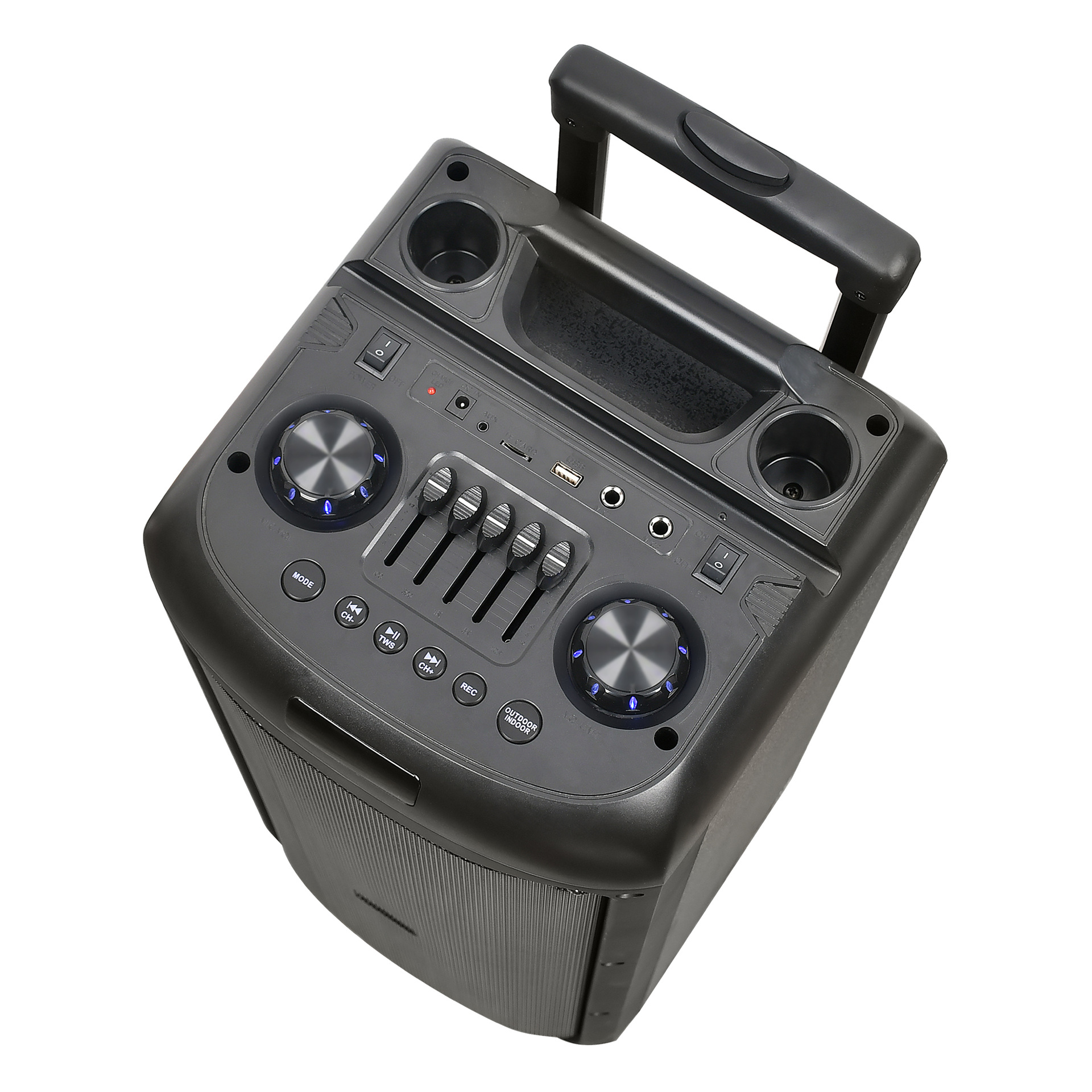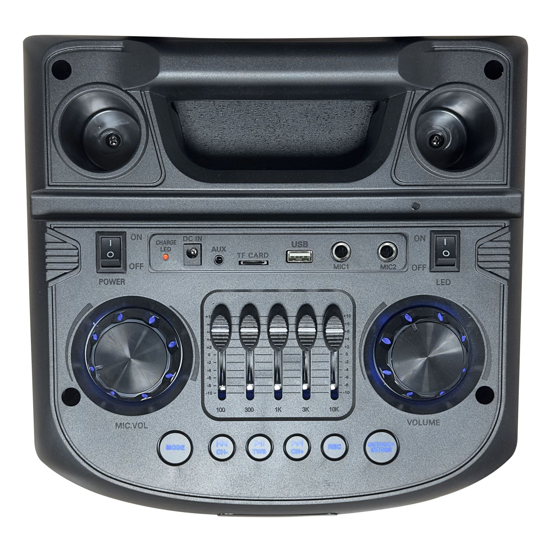 Power: 6 buttons with two large knobs and 5-band EQ, 60W