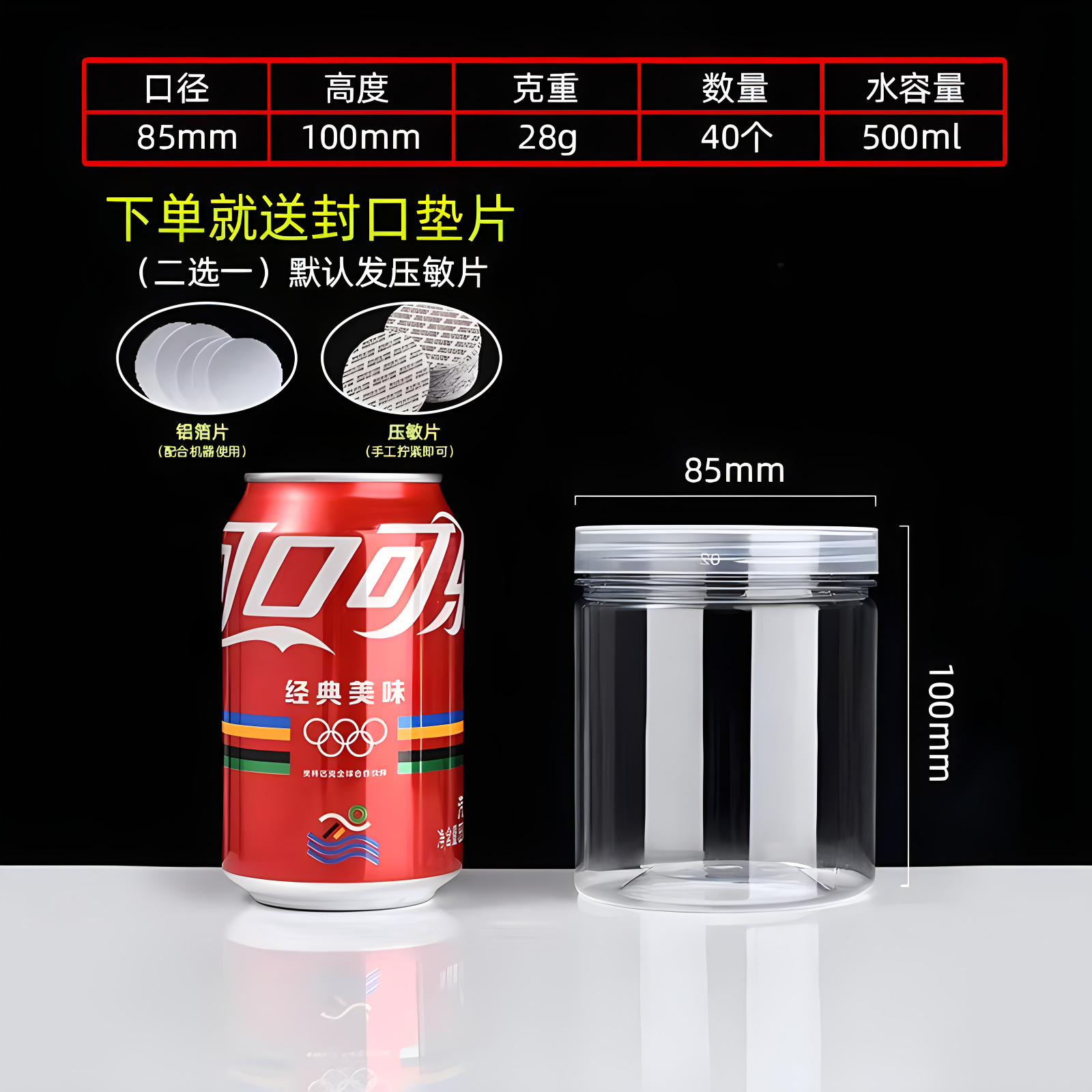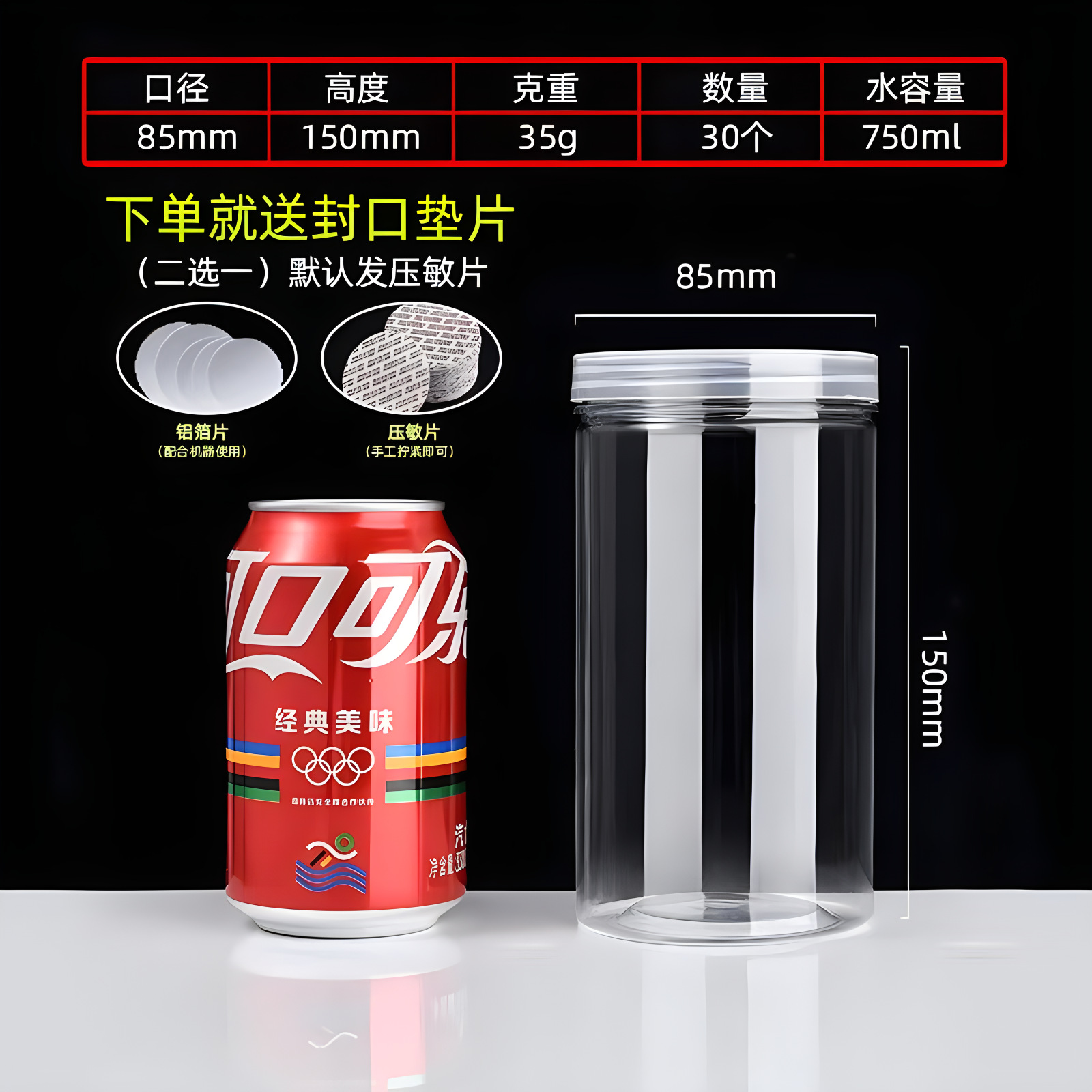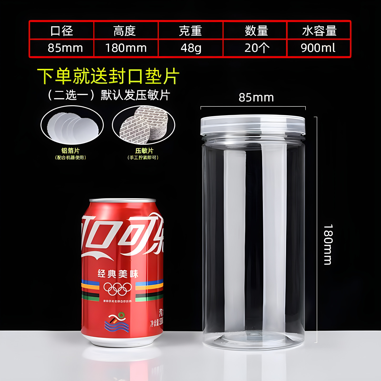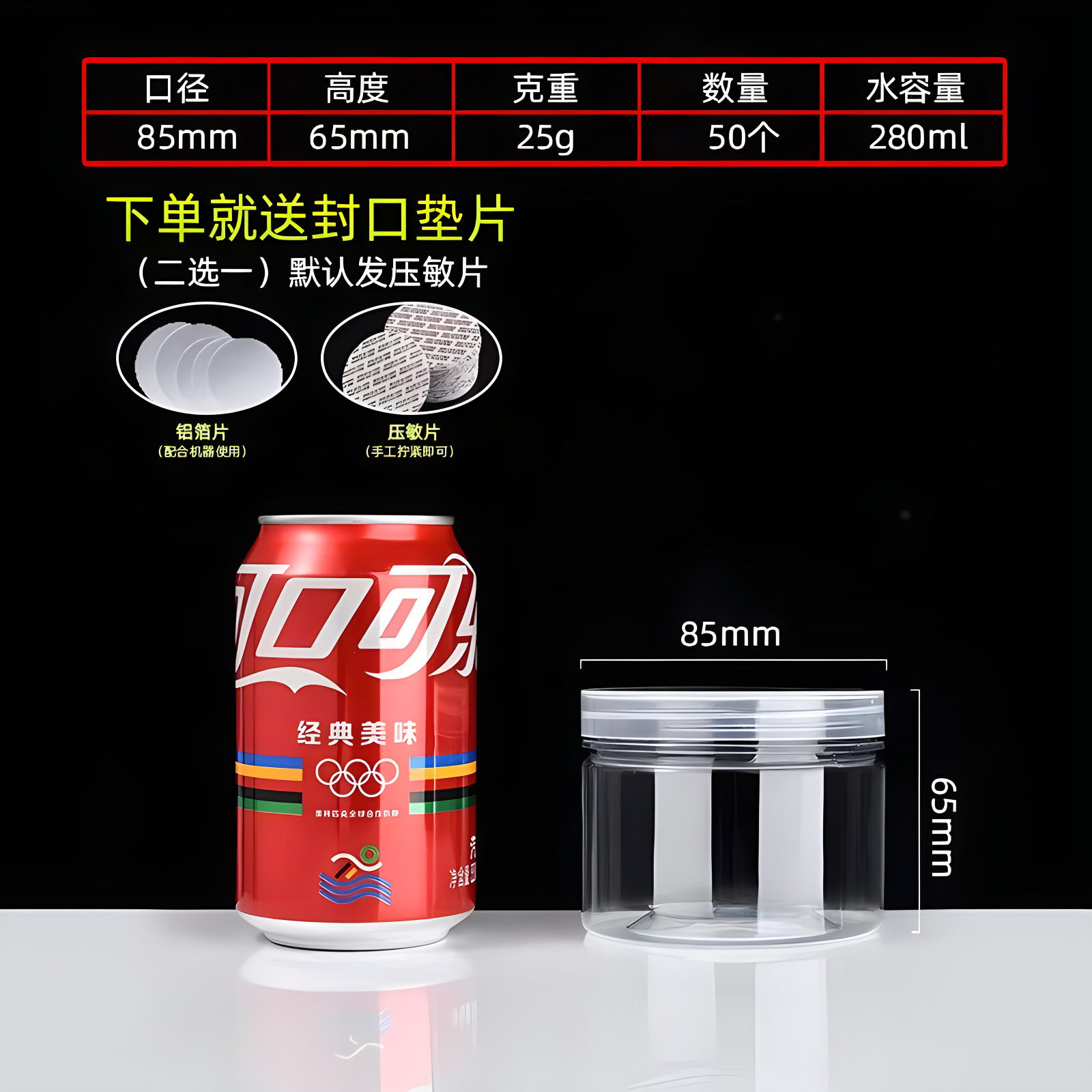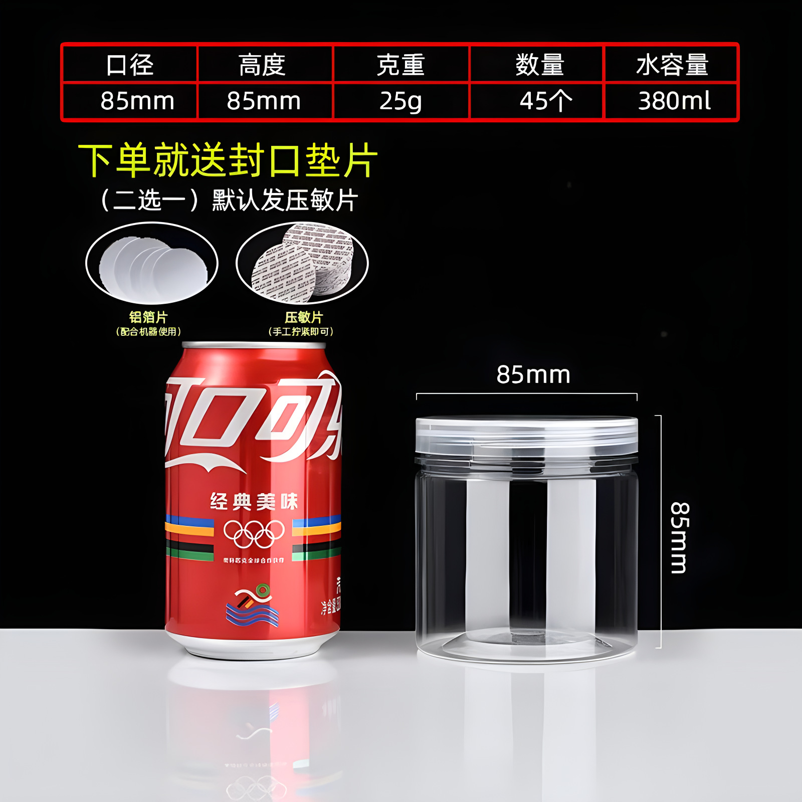 85 in diameter and 85 in height (25g, 462 pcs); crystal lid (pet material)