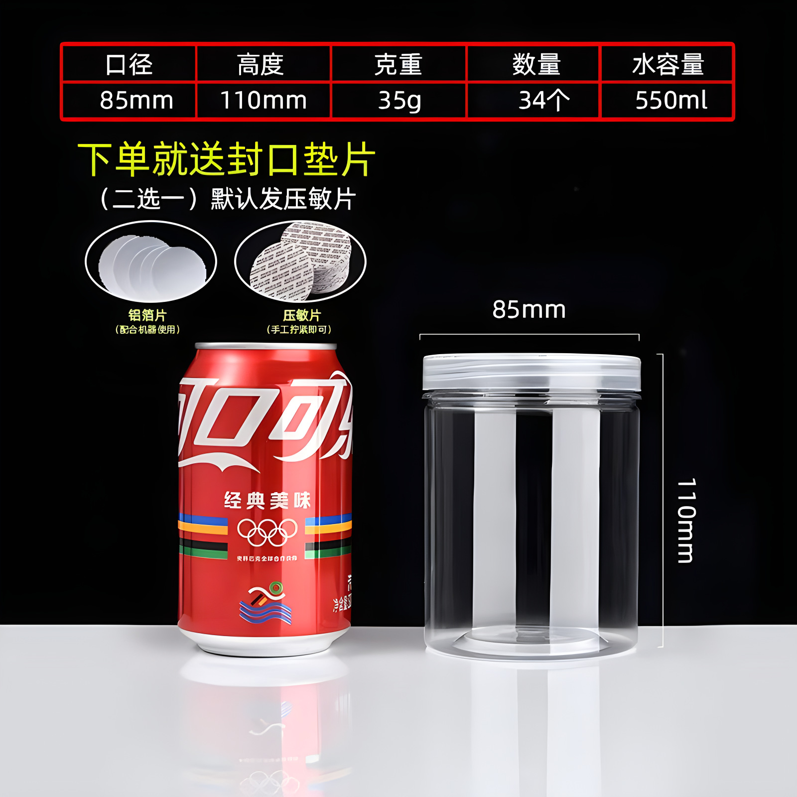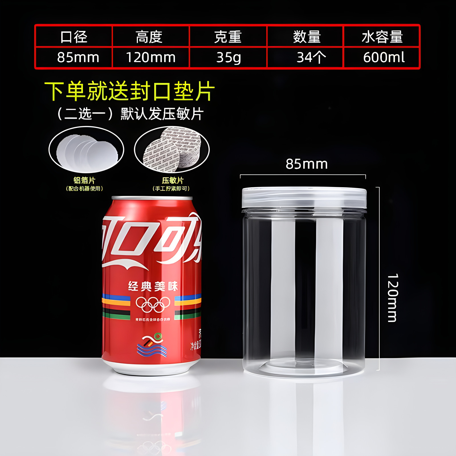diameter 85 high 120(35g 330 pcs); transparent plastic cover