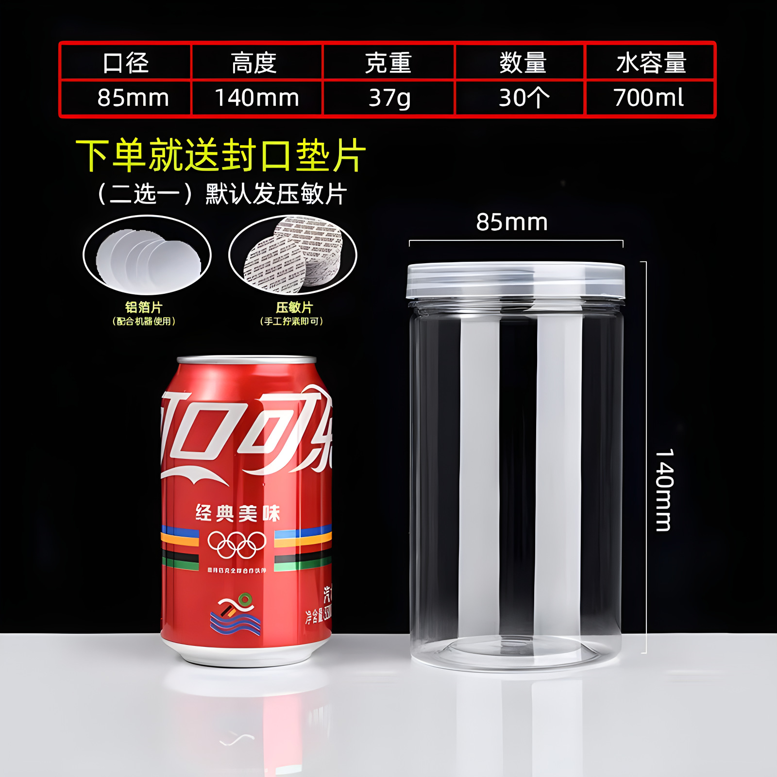 diameter 85 high 120(30g 330 pcs); transparent plastic cover
