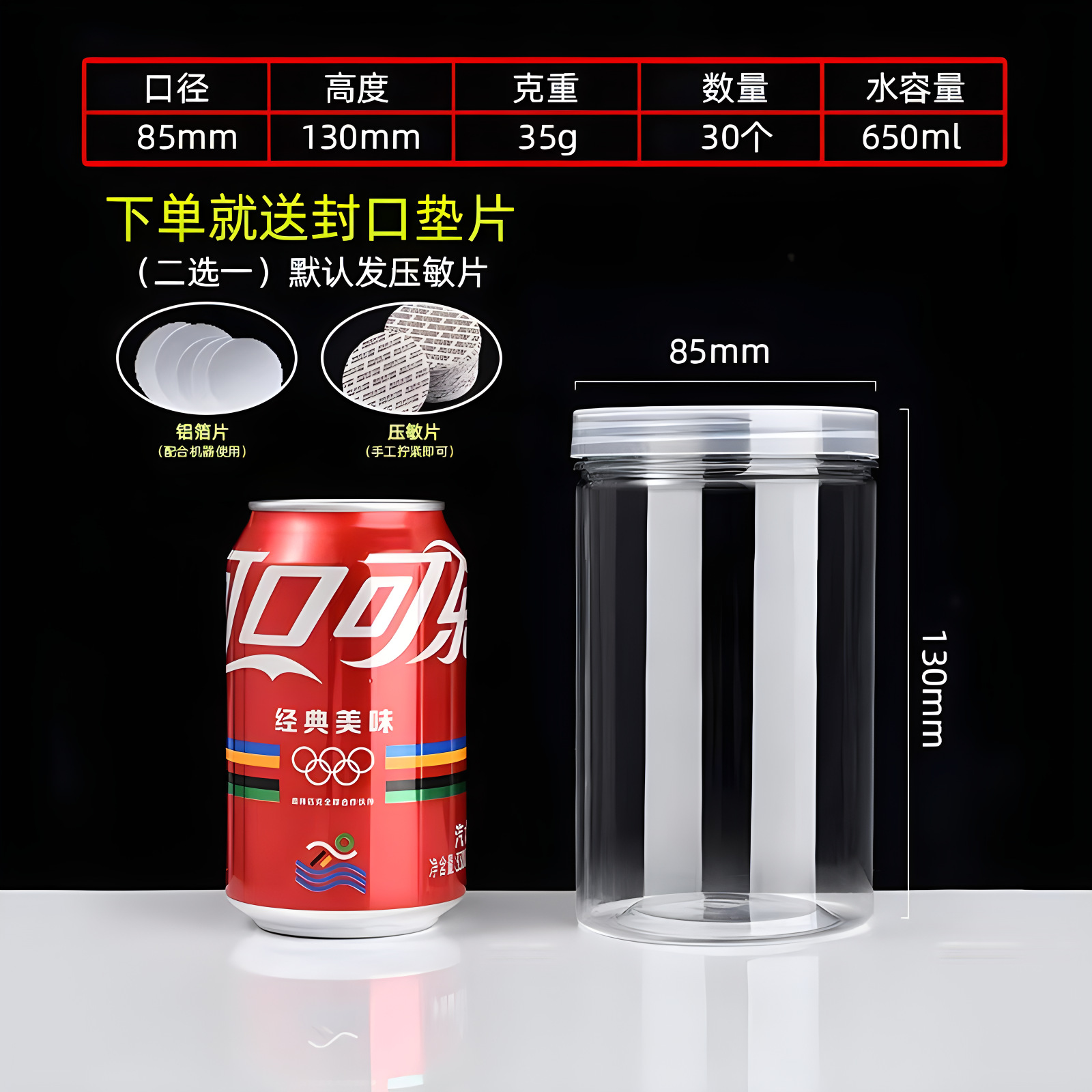 diameter 85 high 130(35g 330 pcs); transparent plastic cover