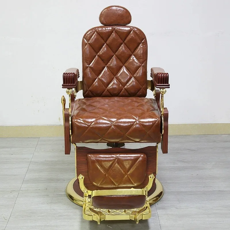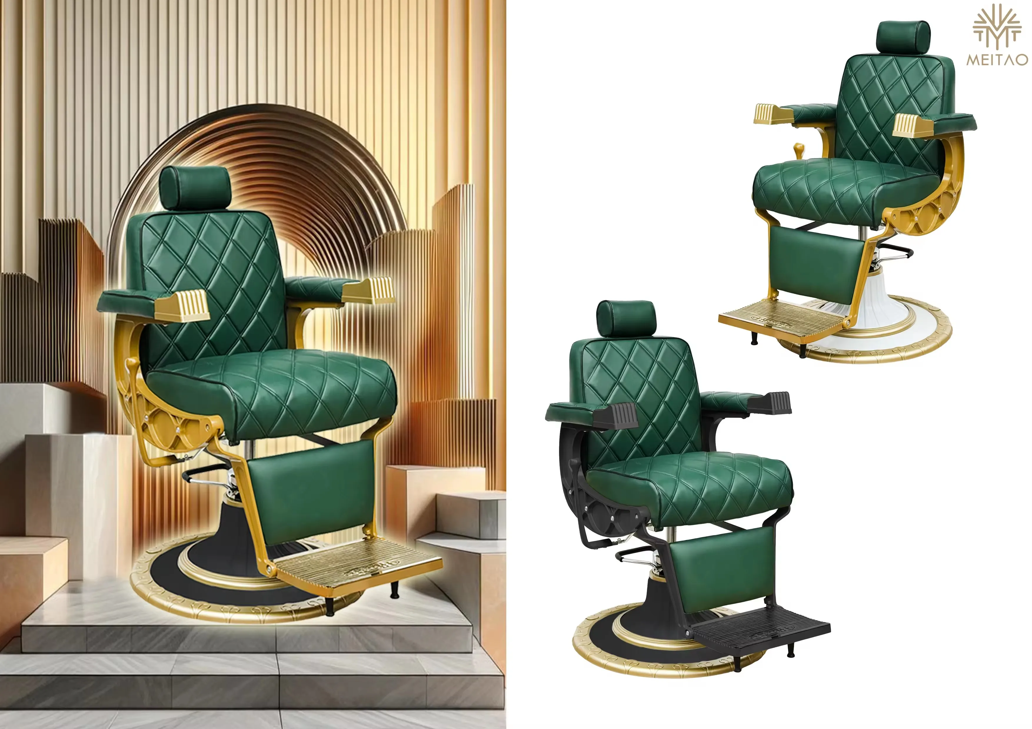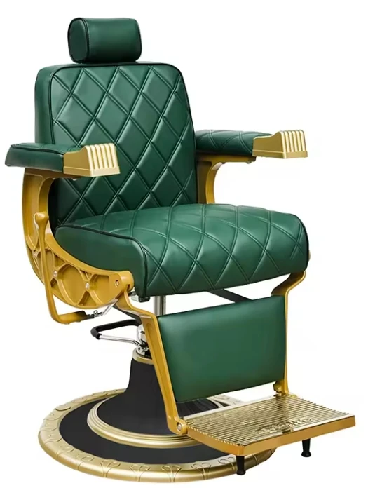 Luxurious green and gold barber chair with unique stitching, raised headrest and decorative metal base.