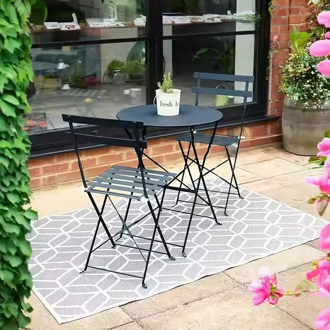 cafe. This industrial-style metal outdoor garden dining set combines functionality with a sleek, modern design. The foldable