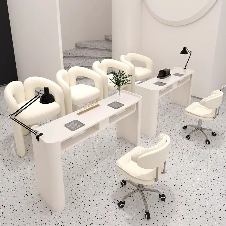 Full White Double Seater Wood Manicure Table Modern Luxury Prosthetic Nail Tables With Lamp And Dust Collector