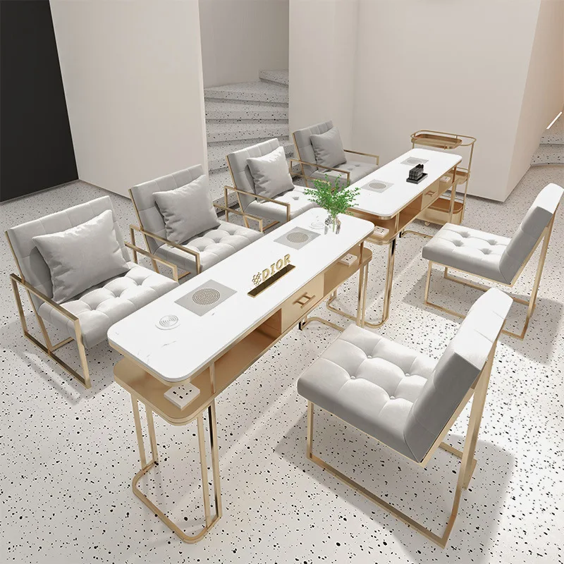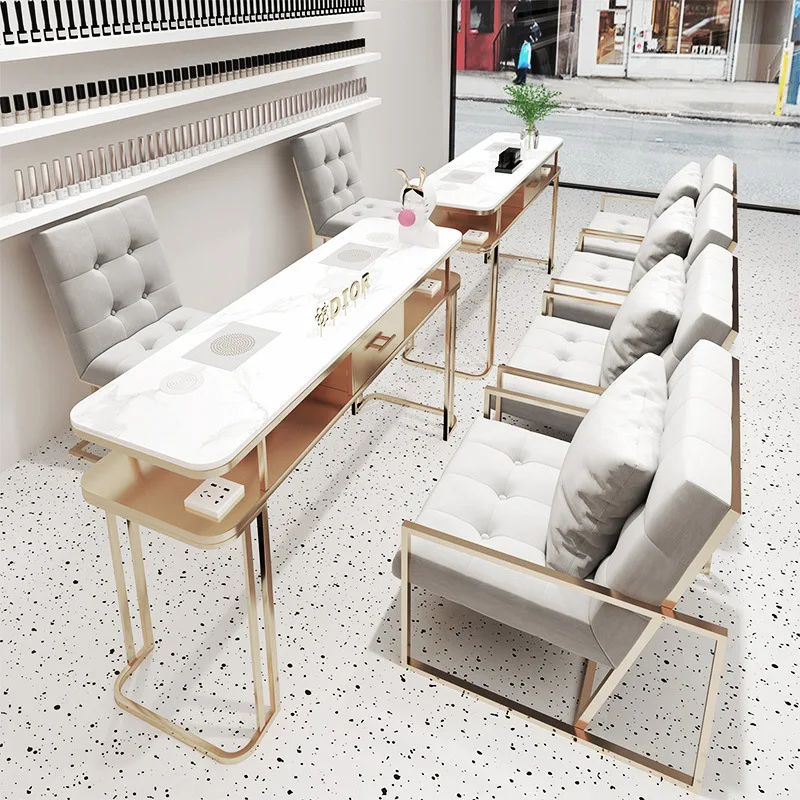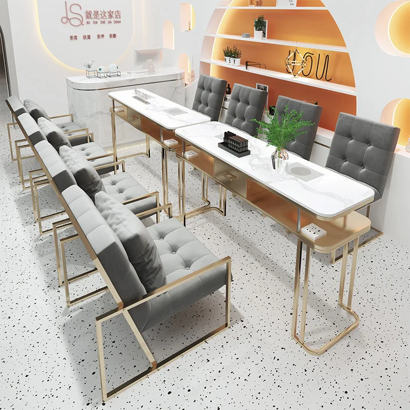 Wanghong Nail Desk and Chair Single and Double Person Vacuum Light Luxury Slate Manicure Table Metal Salon Furniture