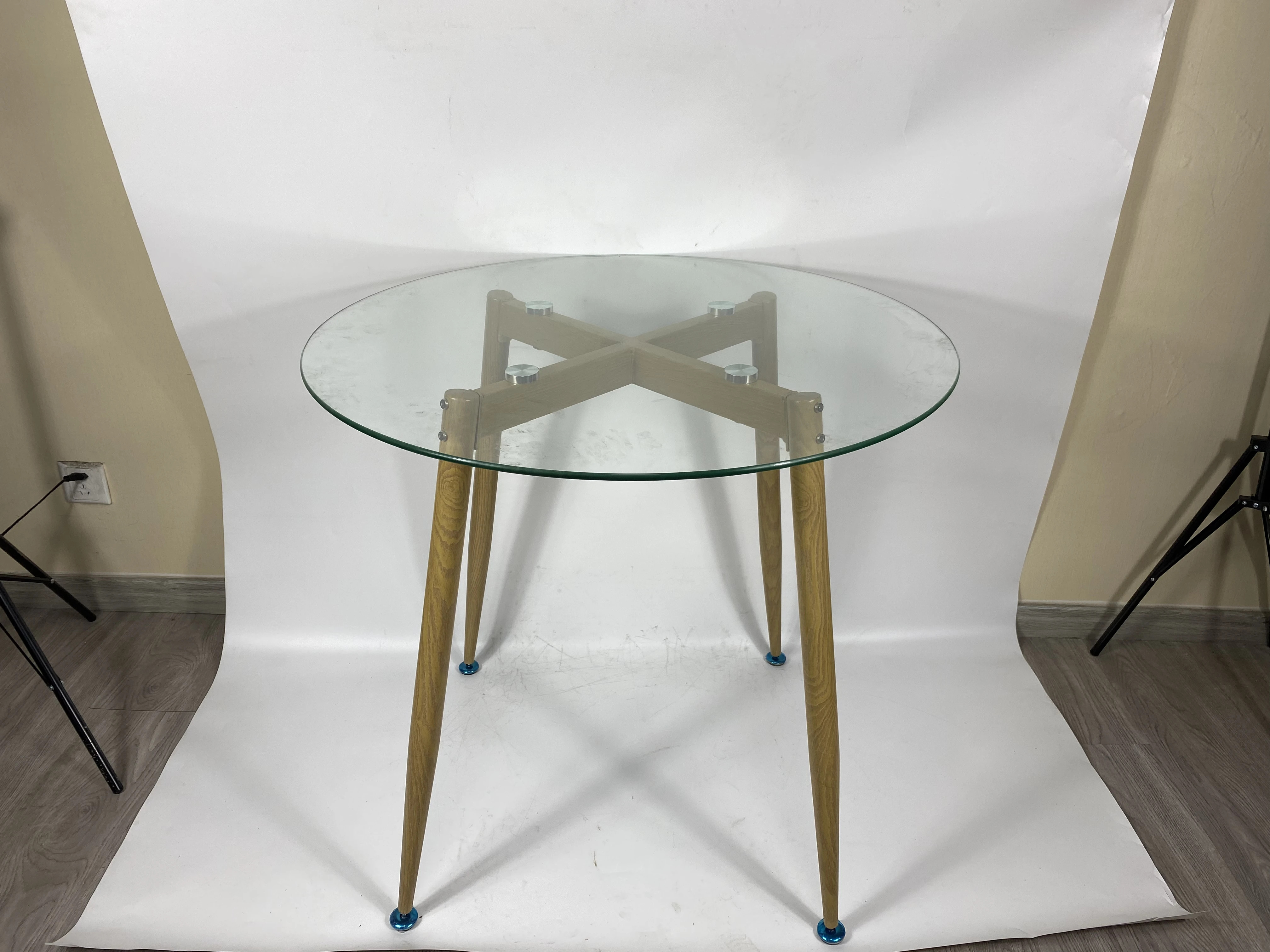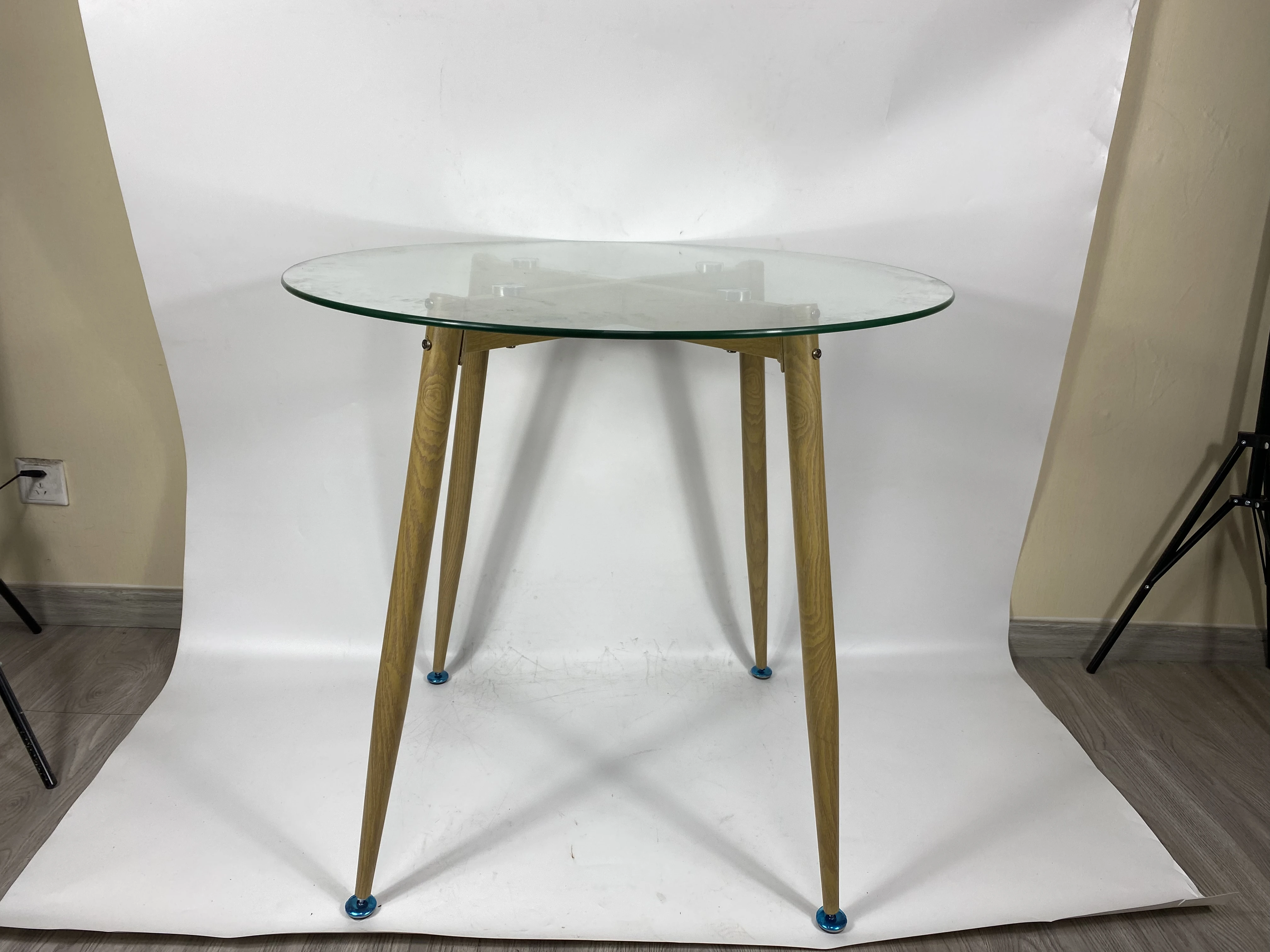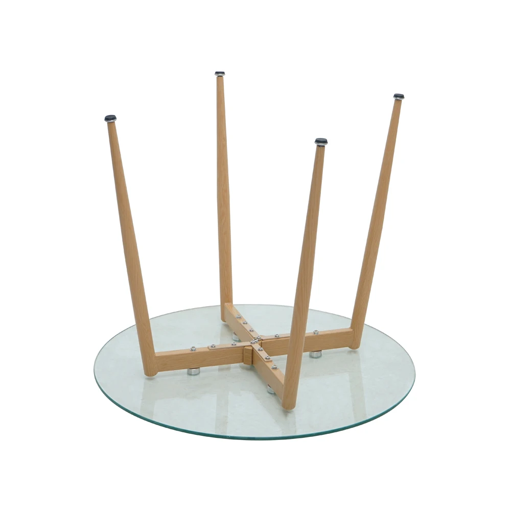French Round Tempered Glass Top Wooden Effect Legs Dining Table