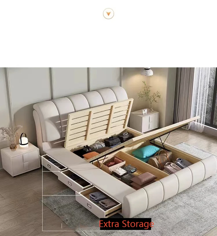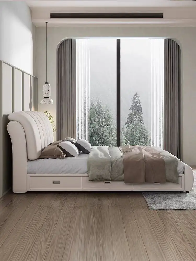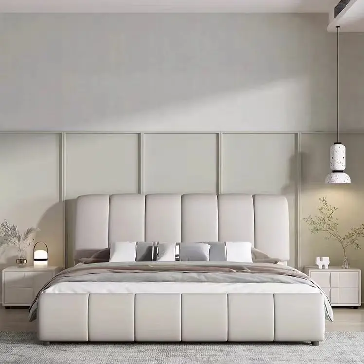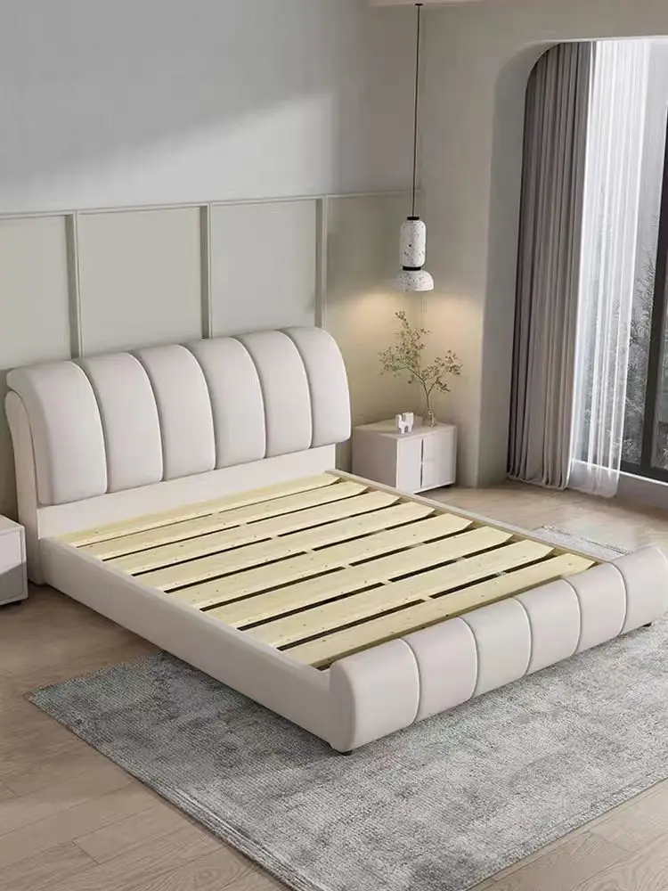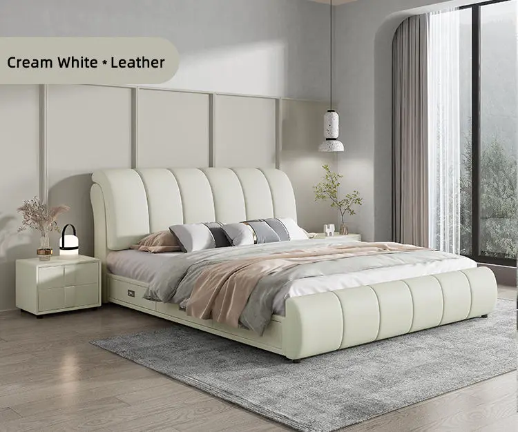 Bedroom Wooden Frame bed Solid Wood Design King Size Leather Elegant White Upholstered with Headboard
