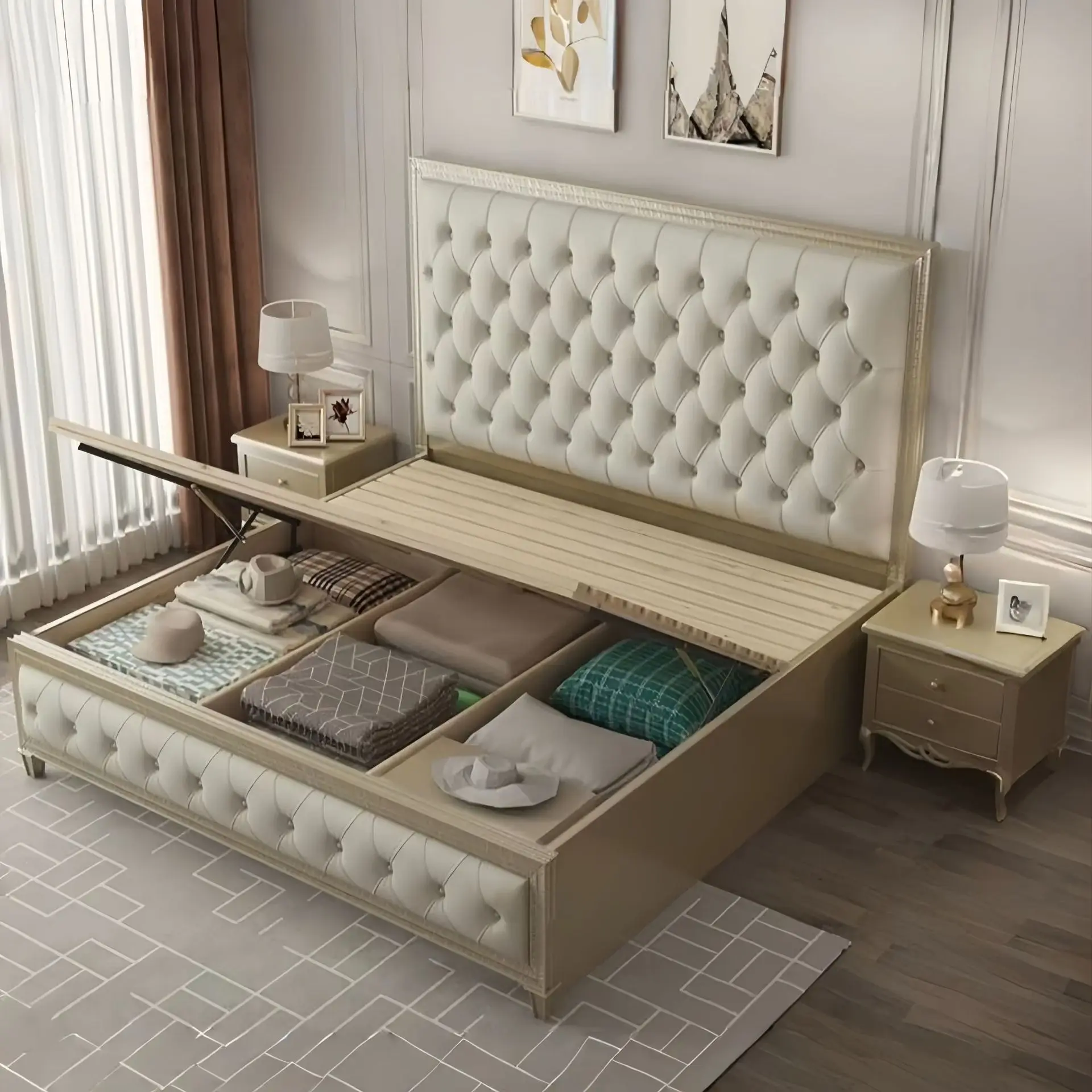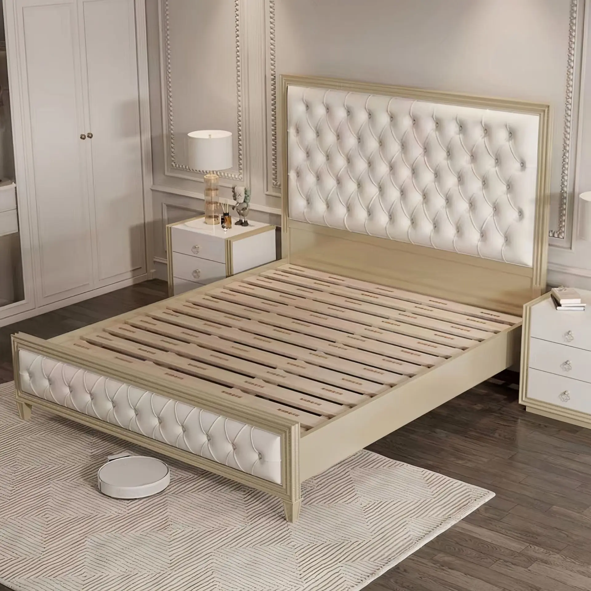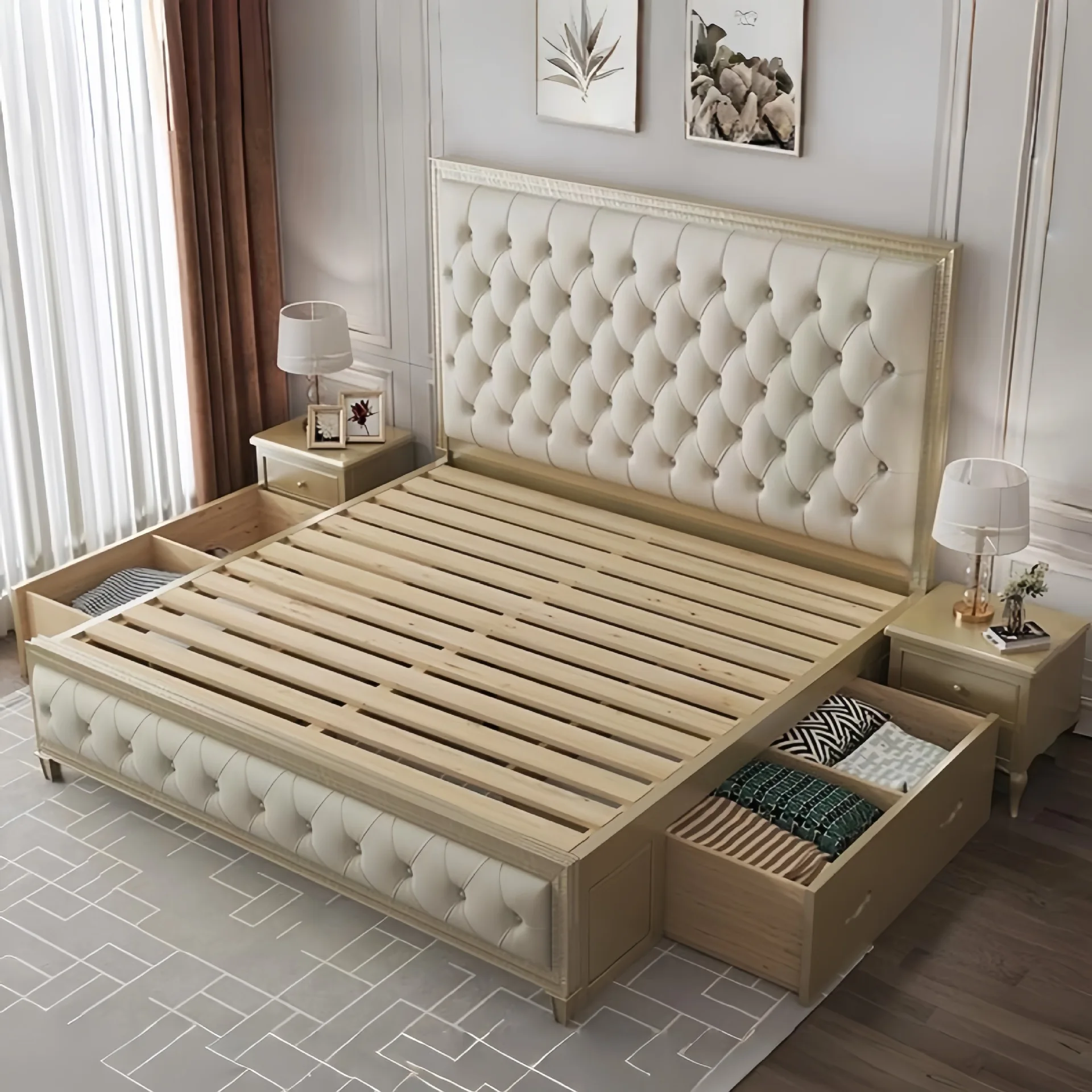 Modern Velvet King Upholstered Bed Frame Storage Bed with Solid Wooden Slat Gold Metal Frame Upholstered Bed