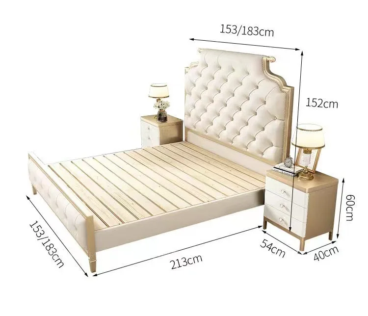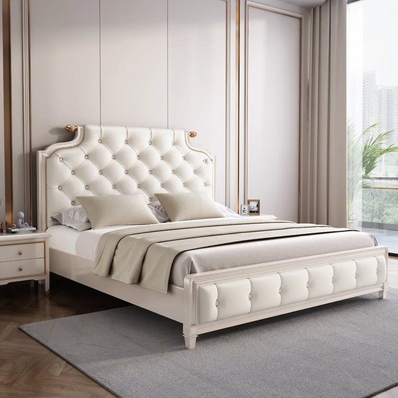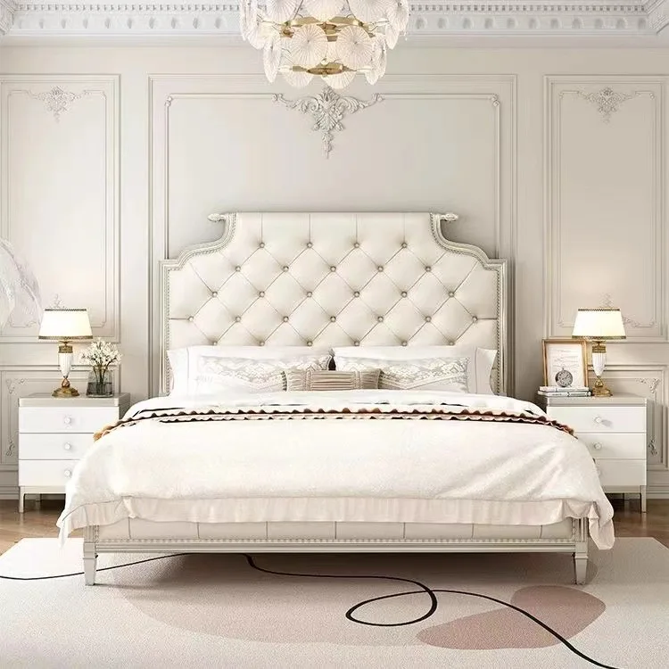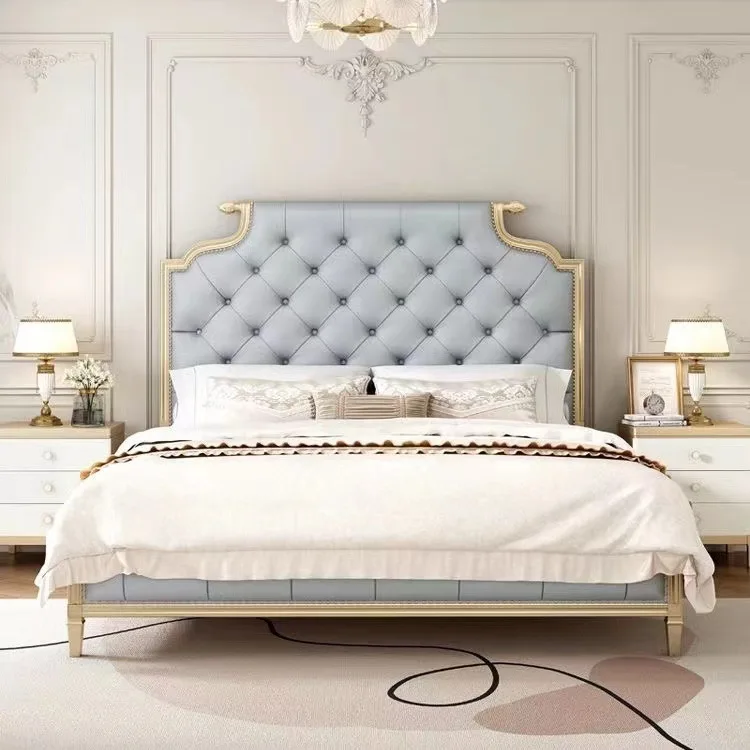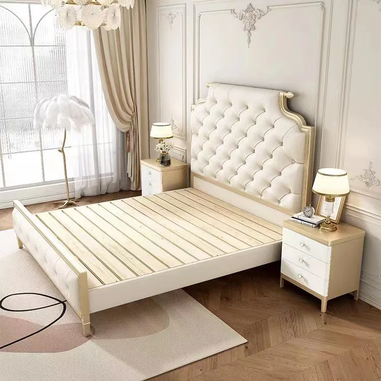 Bedroom Furniture Set Luxury European Solid Wood Frame Modern Leather Antique King Queen Size Champagne Bed