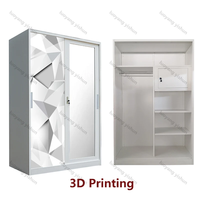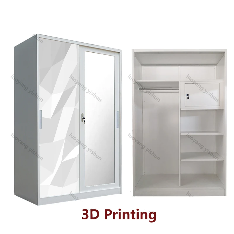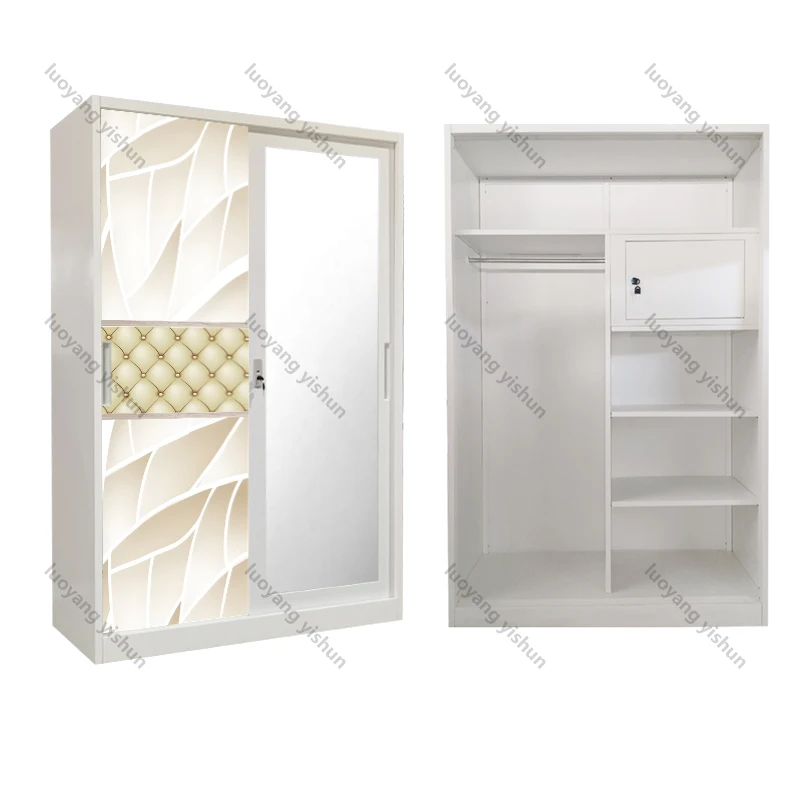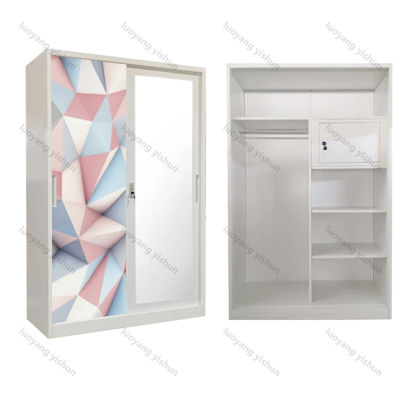 Factory supply customized pattern steel wardrobe bedroom wardrobe sliding door with mirror and drawer LEMARI PAKAIAN