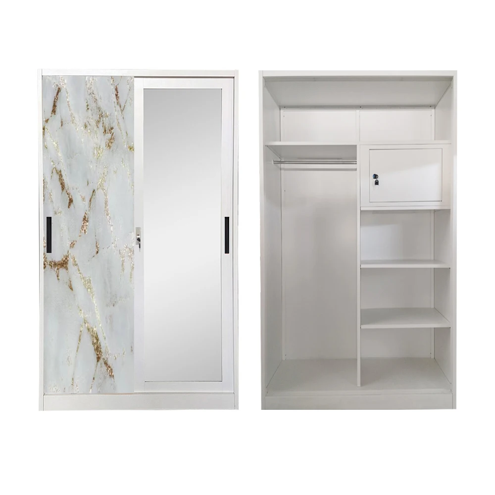 Bedroom Steel Cabinet Closet Wardrobe Steel Almirah Wardrobe With Safe Box 2 Sliding Door Printing Metal Wardrobe