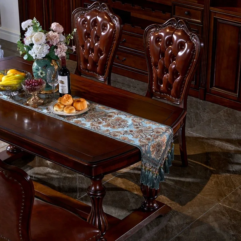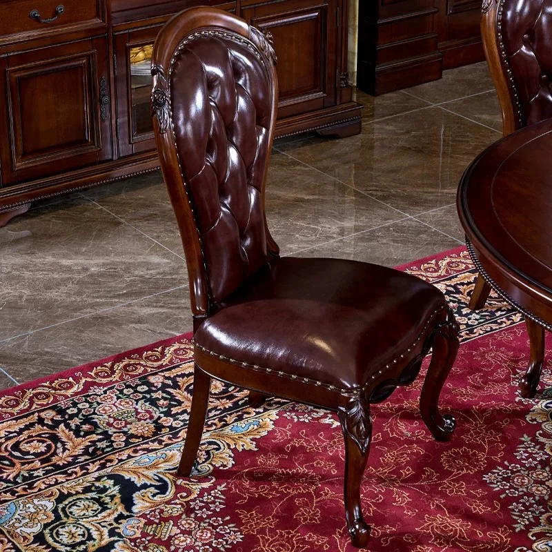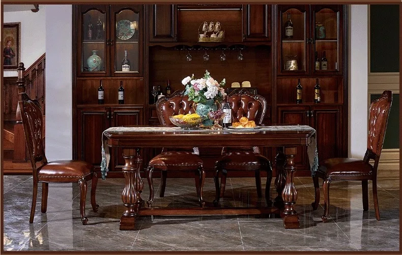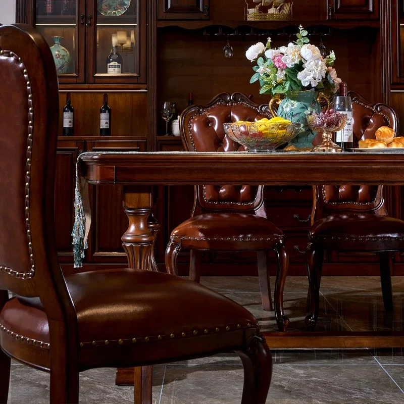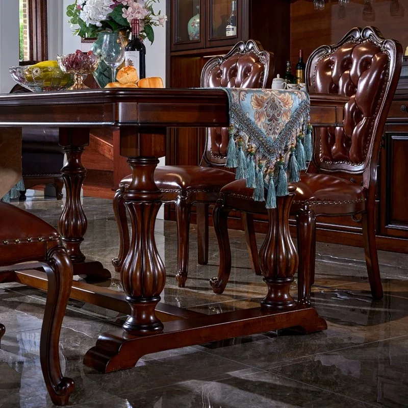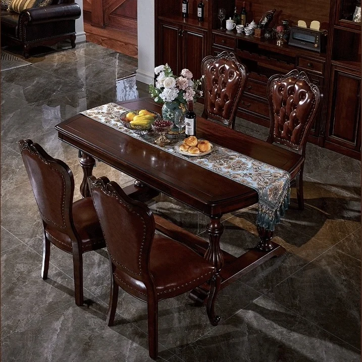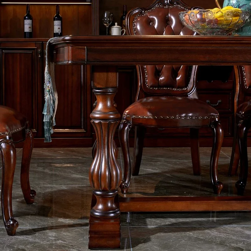 American Solid Wood Dinning Table Set For 6 Rectangle Classic Retro Mahogany Villa Western Dining Table Carved Leather Chair