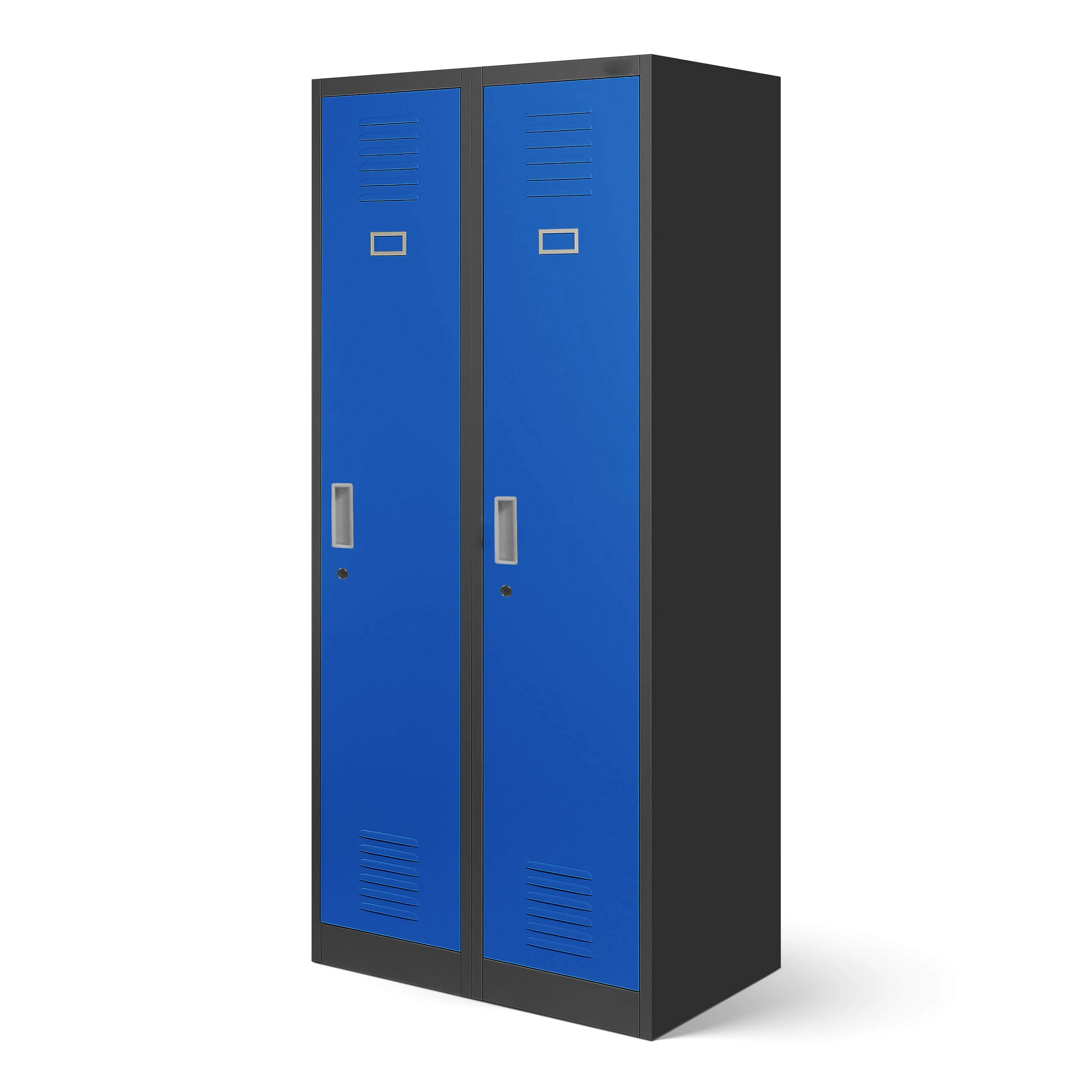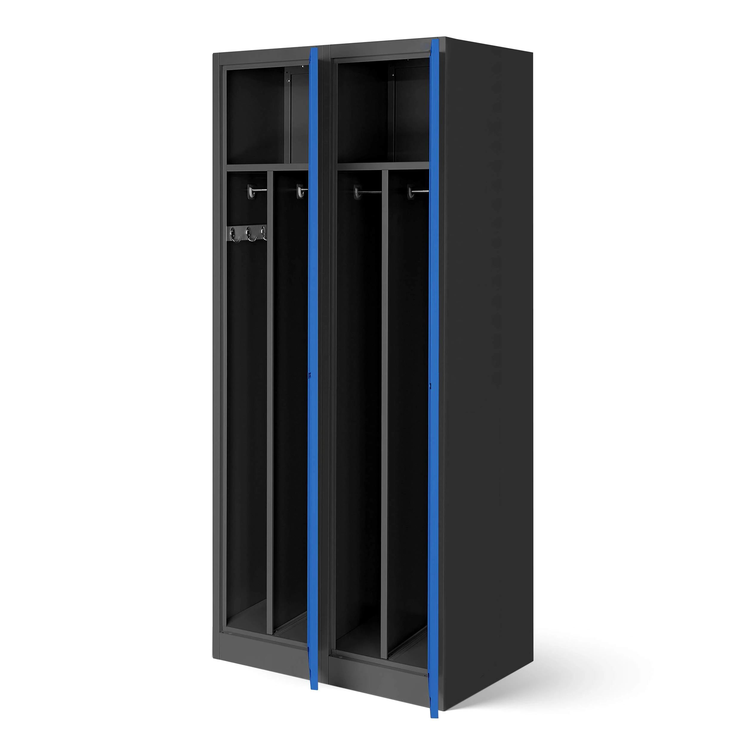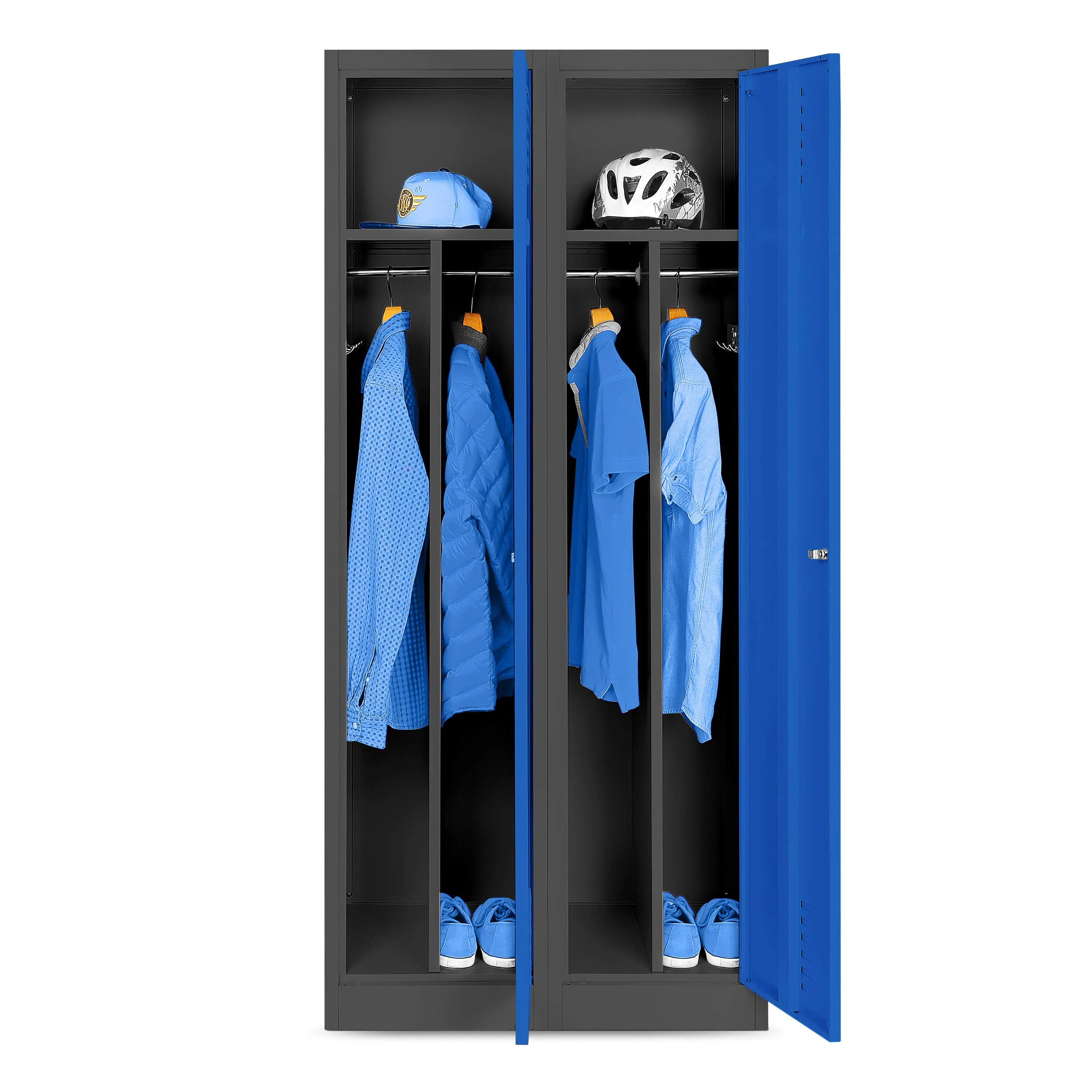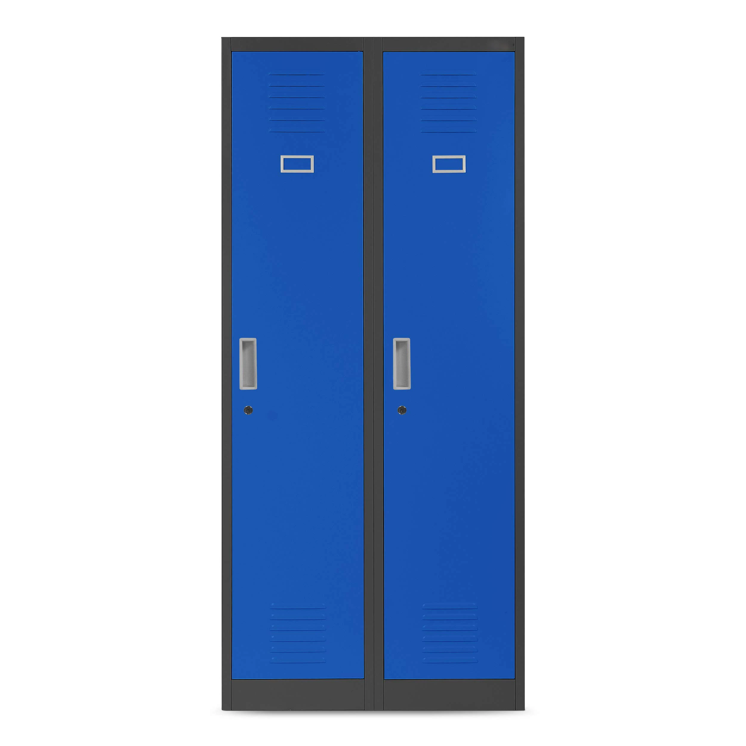*High-quality steel. Sturdy construction. Security cylinder lock with two keys *Divider for clean and dirty clothing4 coat hooks per compartmentVentilation slots on each doorOne clothes rail per compartmentOne label holder per door *Delivered for self-assembly. Includes assembly instructions (English language not guaranteed), video assembly instructions (see product images).