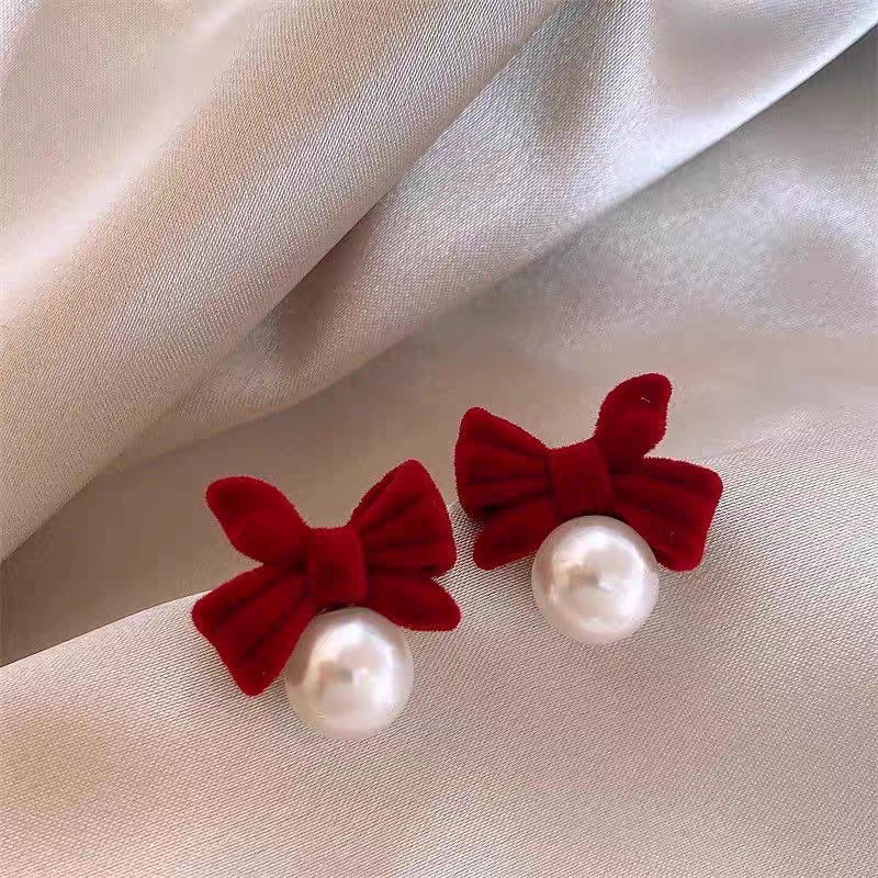 pearlred velvet bow stud earrings
