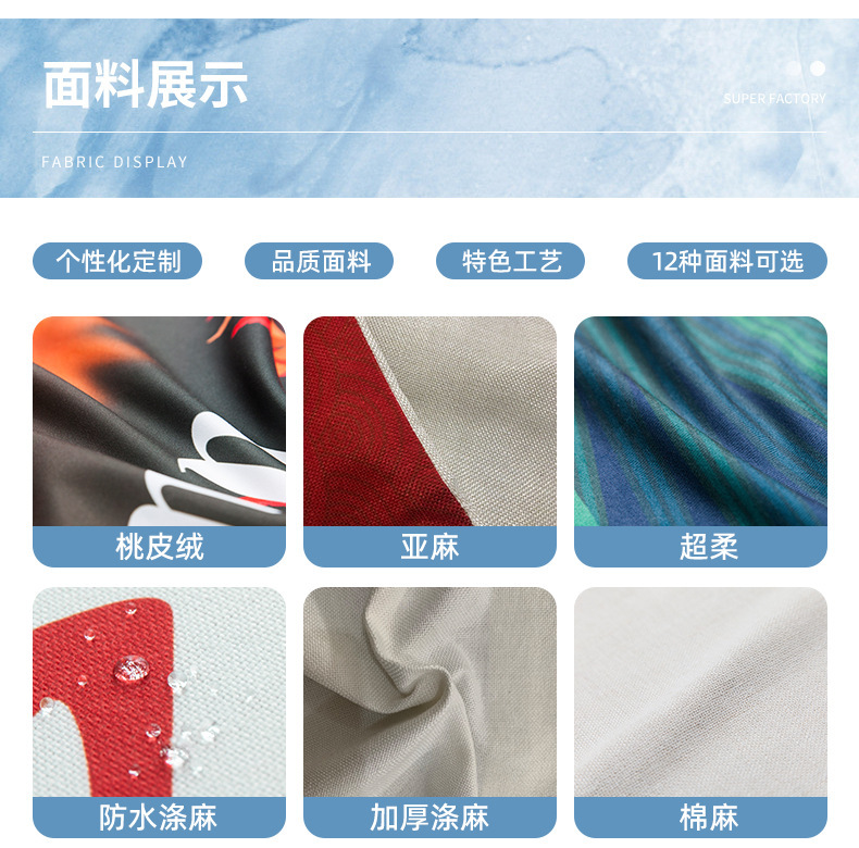 Our store offers four types of materials: ultra-soft (ultra-short fleece), polyester flannel (peach skin), linen, and cotton-linen blend. All patterns can be customized using these four materials. When making a purchase, please inform our customer service of the material you require.
