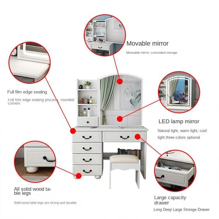 Wooden Bedroom White Led Lights Modern Dressing Table Makeup Vanity With Mirror And Stool