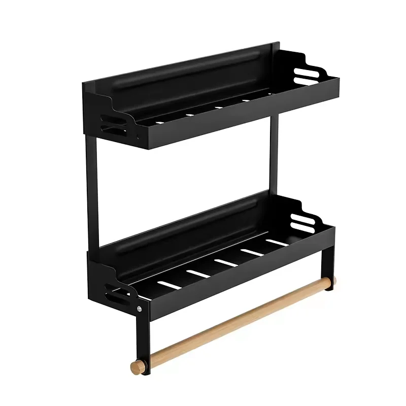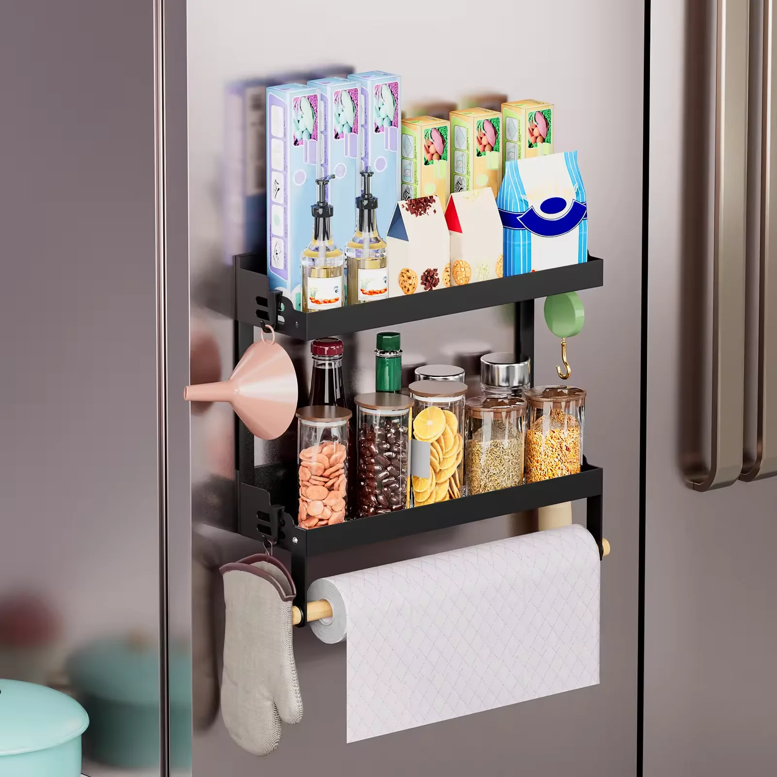 Kitchen spice storage container with three layers of multifunctional space saving magnetic refrigerator shelf