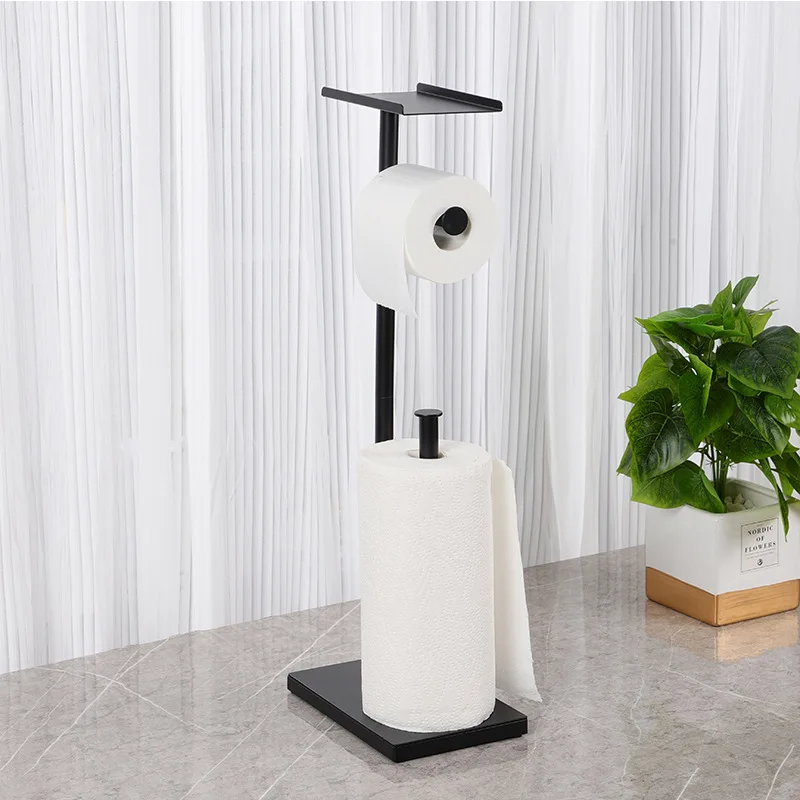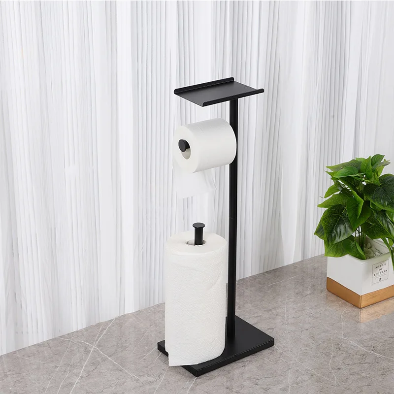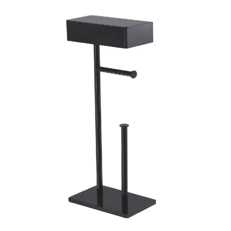 No Punch Black Metal Bathroom Double Toilet Paper Roll Holder With Shelf, Upgrade Free Standing Toilet Paper Roll Holder Stand