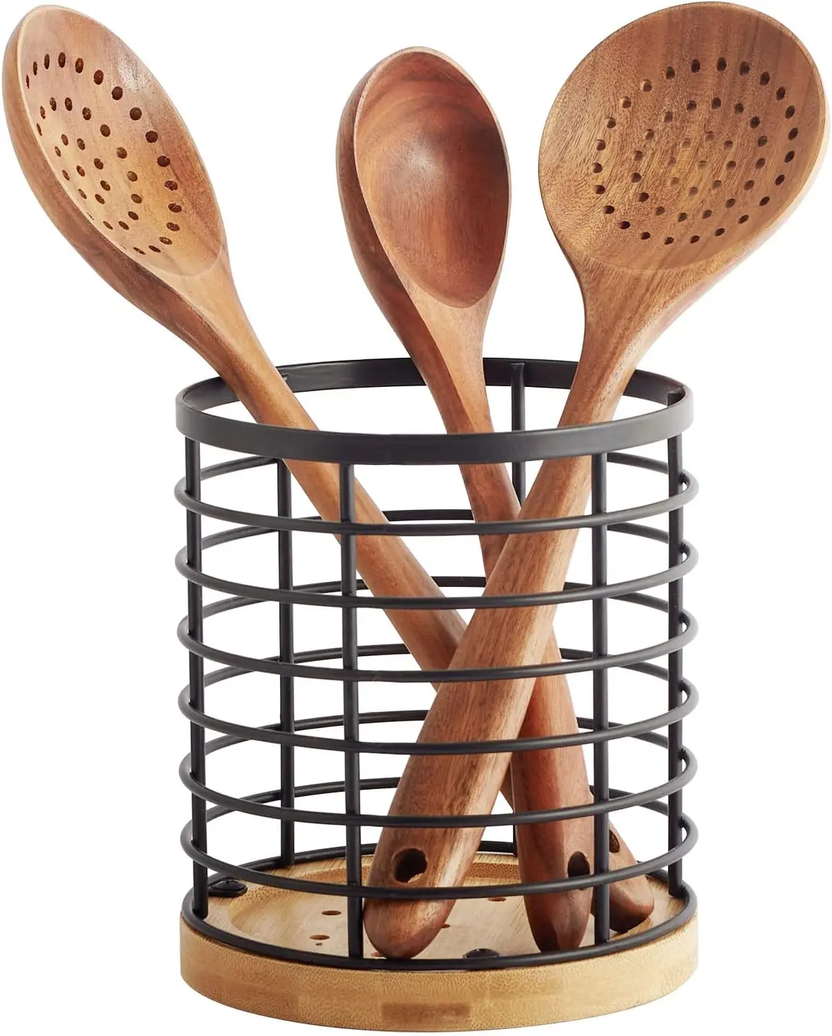Large Round with Wooden Base Matte Black Cooking Utensil Holder Utensil Organizer