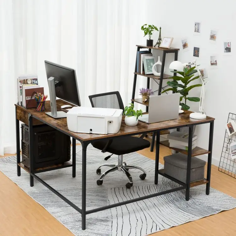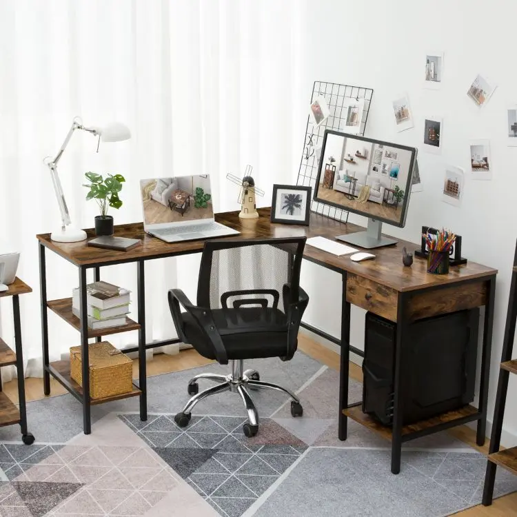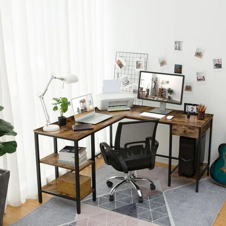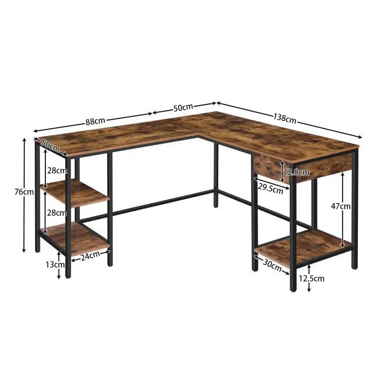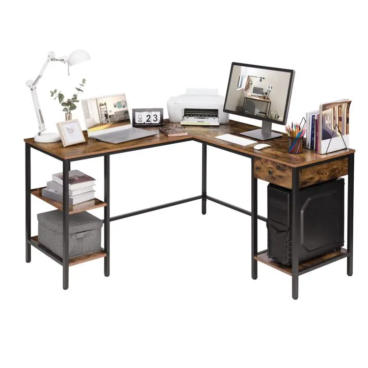 Large Industrial Corner Computer Desk, L-Shaped Home Office Desk with Drawer and 3 Shelves, PC Workstation, Vintage Game Table