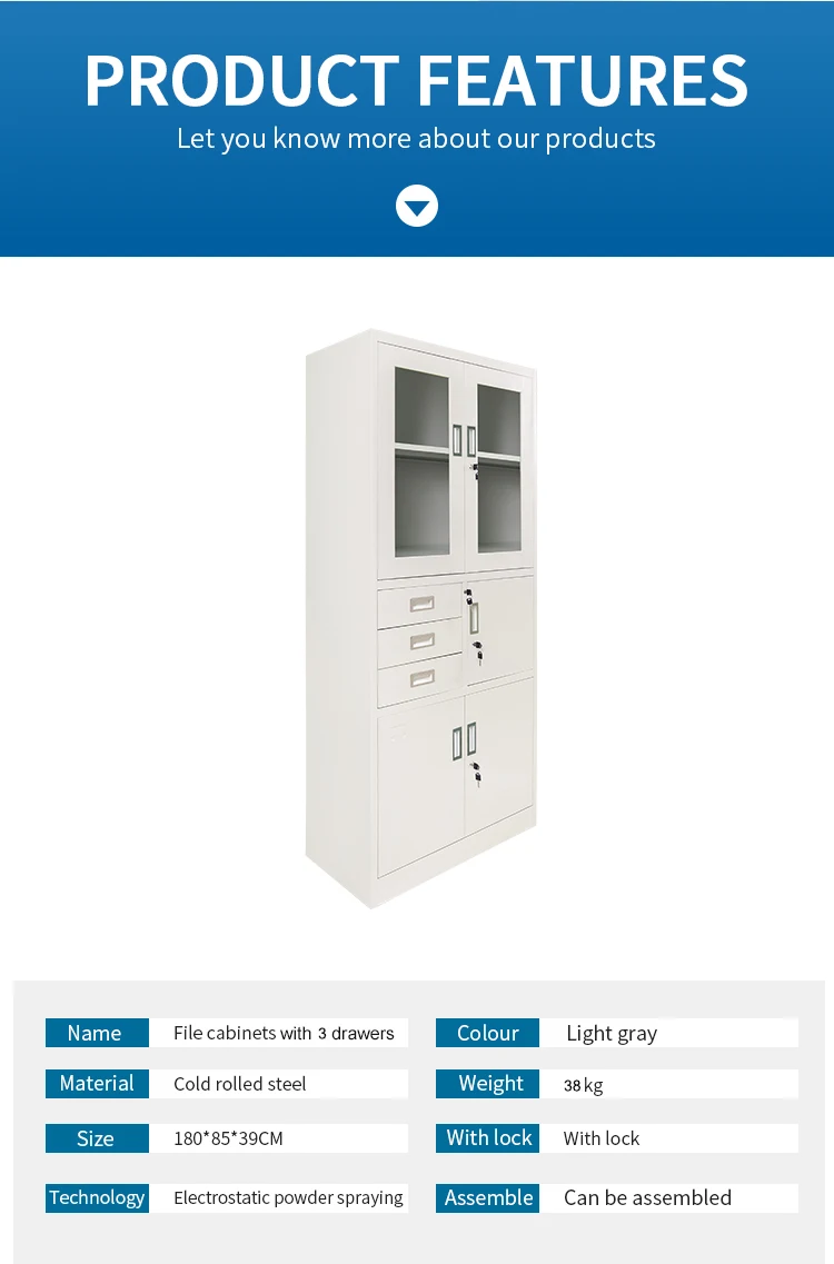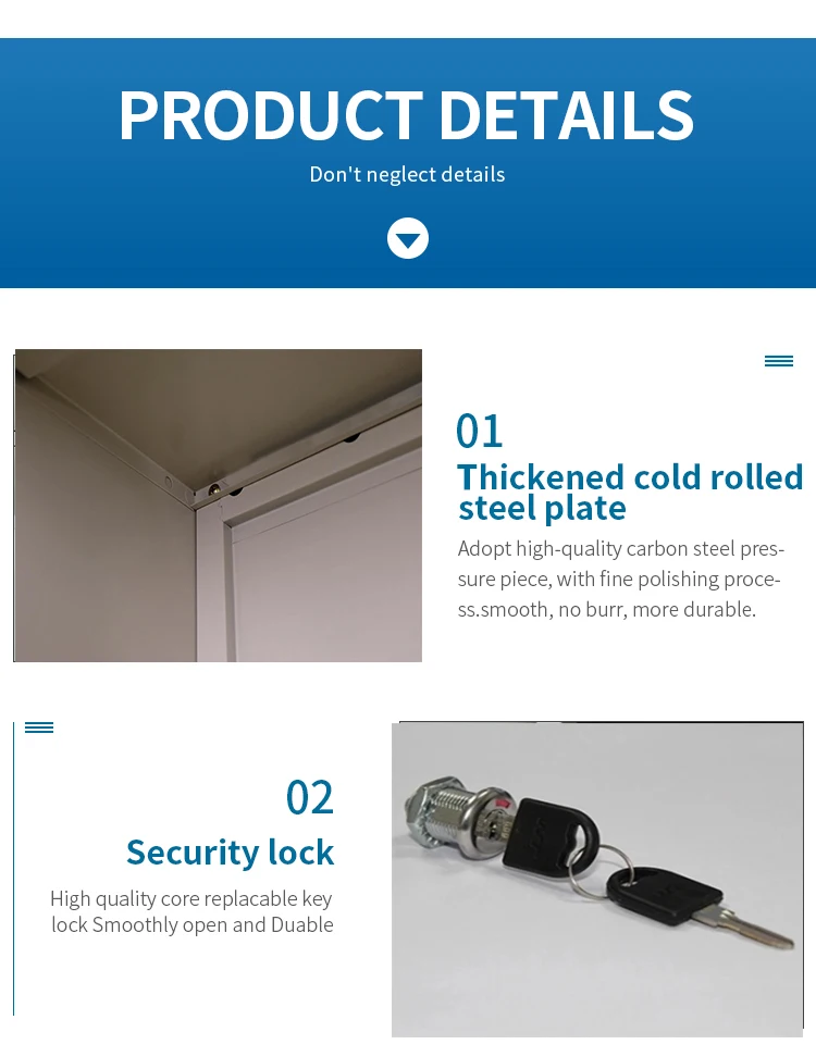 Product Features: 1. High quality cold rolled steel plate is stamped and formed at one time, firm and durable. 2. Laser welding, precise and firm, high loading capability of drawers. 3. The surface is through pickling, collision and electrostatic powder spraying, so can prevent paint peeling and rust. 4. Finishing assembly only needs 5-8 minutes. 5. Customization is available, included thickness of material, size, color, type of lock, type of handle, etc.