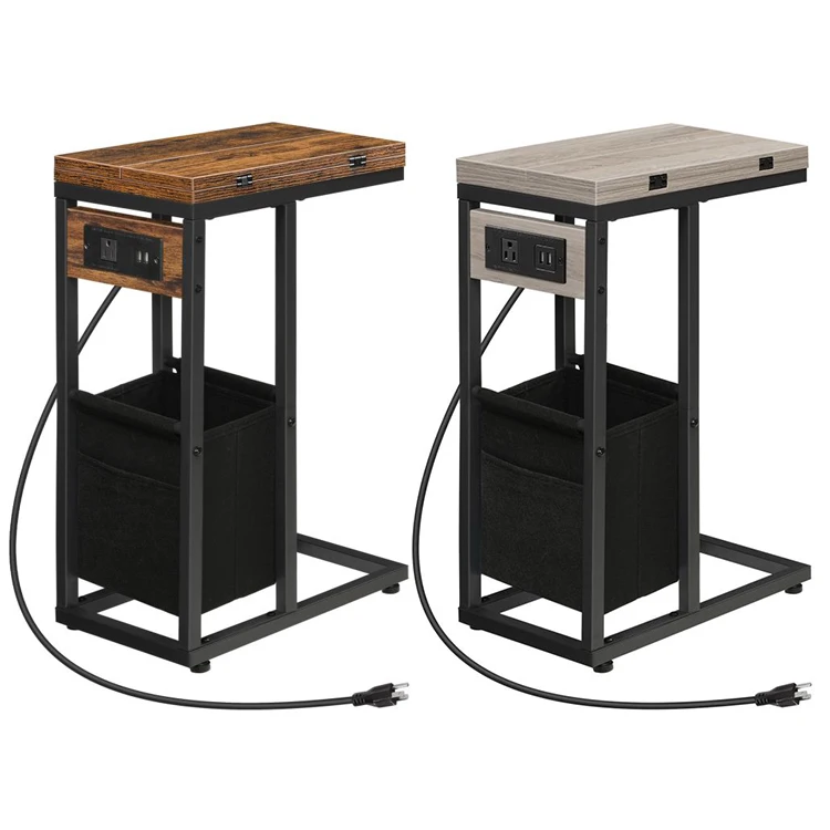 Wholesale Industrial Style Wood Sofa C Shaped Console Table with Charging Station C Shaped Side End Table with Wheels Storage